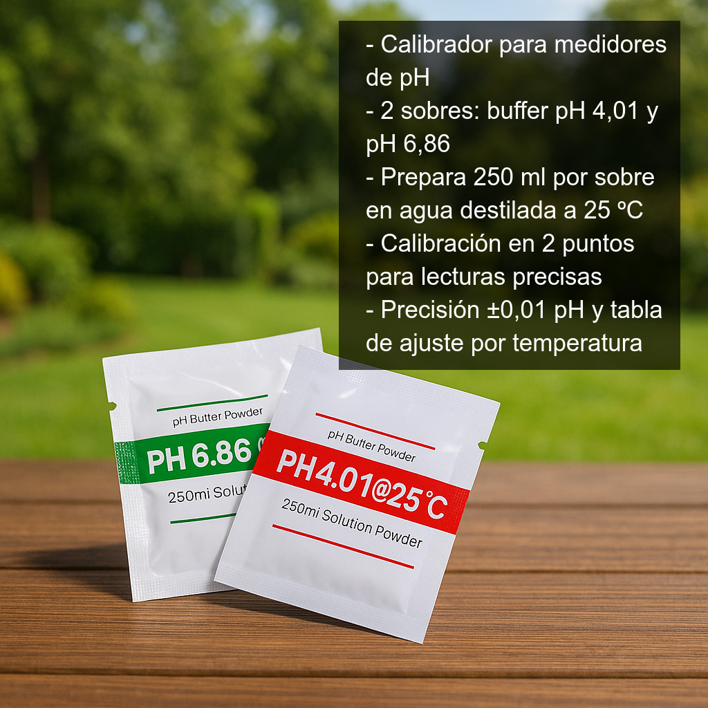 En la parte trasera de cada sobre se incluye una tabla de ajuste para corregir el valor de referencia si la calibración se realiza a una temperatura distinta de 25 ºC. Esto es especialmente útil si calibras en un entorno más frío o más cálido, ya que el pH de las soluciones buffer varía ligeramente con la temperatura.
