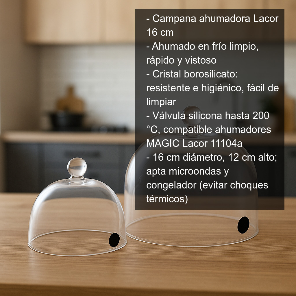 Campana ahumadora de 16 cm para ahumar alimentos en frío de forma limpia, rápida y muy vistosa. Ideal para usar con un ahumador en frío y conseguir un acabado profesional en mesa, concentrando el humo alrededor del alimento para potenciar aromas sin cocinarlo.