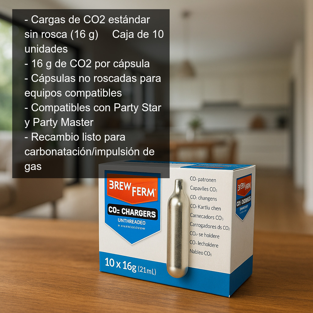 Cargas de CO2 estándar sin rosca (16 g) – Caja de 10 unidades. Estas cápsulas de CO2 no roscadas contienen 16 gramos de dióxido de carbono cada una y están diseñadas para aportar una carbonatación/impulsión de gas fiable en equipos compatibles. Son una opción práctica tanto para uso doméstico como para eventos, cuando necesitas recambios de CO2 listos para usar.