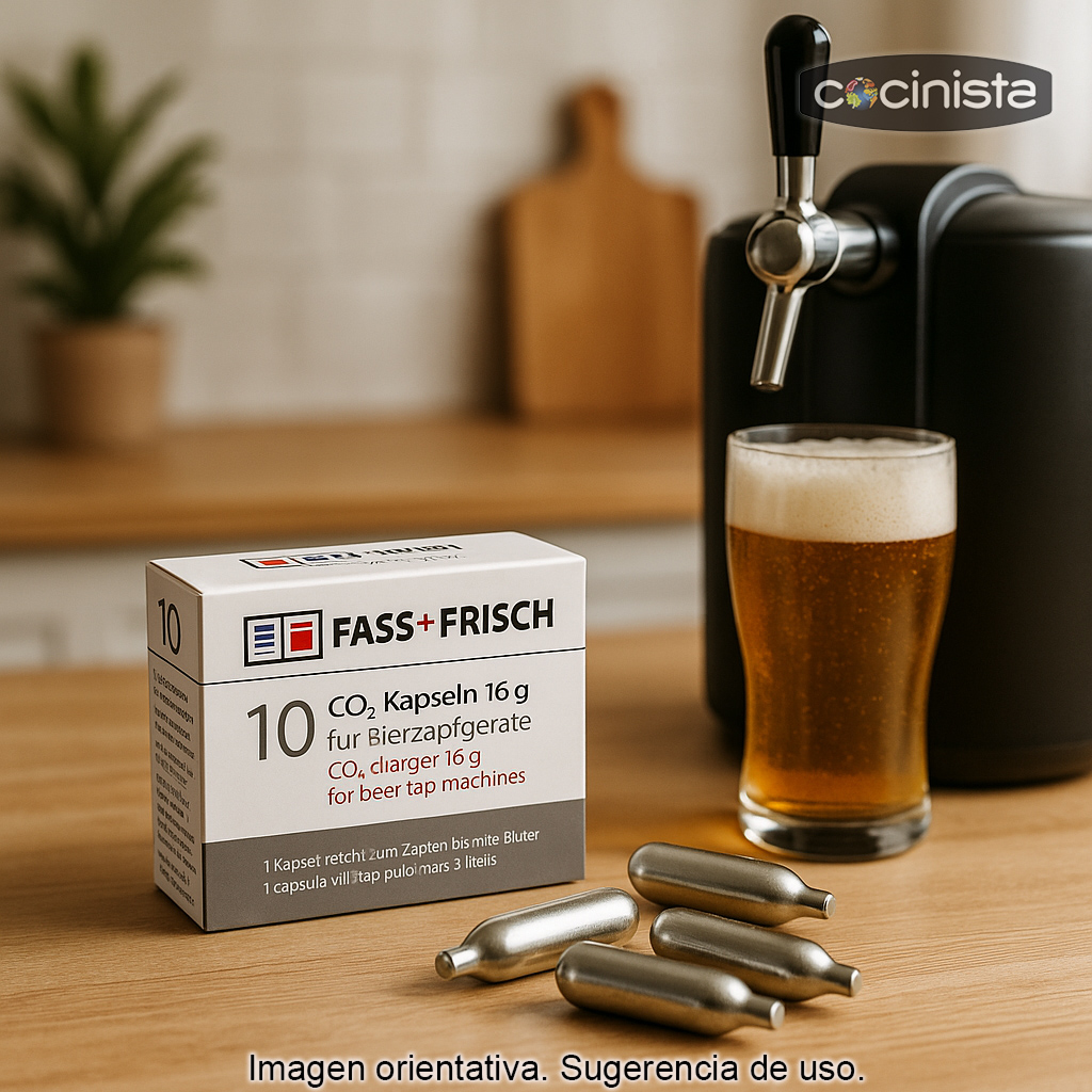 Estas cargas están indicadas para tiradores de cerveza y dispositivos compatibles que acepten cartuchos lisos de 16 g. Son especialmente útiles para quienes disfrutan de cerveza en barriles de 5 litros, ya que ayudan a mantener una presión estable durante el servicio y a conseguir un tirado más regular.