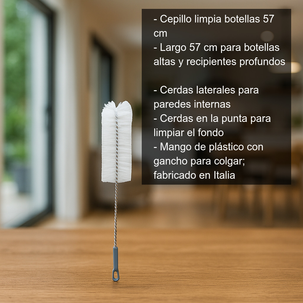 El cepillo limpia botellas de 57 cm es el accesorio ideal para mantener impecables tus botellas y recipientes de cuello estrecho. Diseñado específicamente para llegar donde una esponja no alcanza, permite una limpieza profunda del interior con total comodidad, ayudando a eliminar restos de bebida, posos y suciedad acumulada.