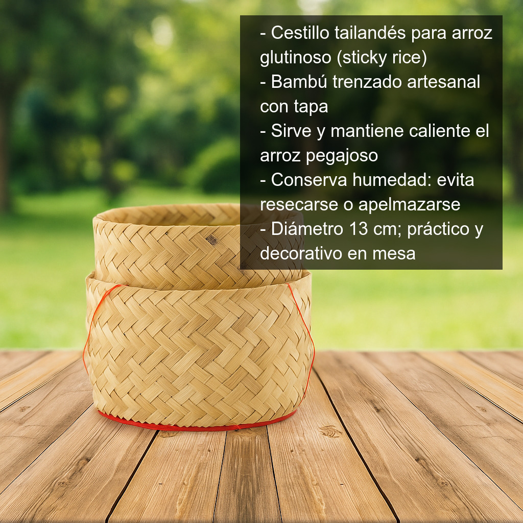 Cestillo tradicional tailandés para arroz glutinoso (sticky rice), elaborado artesanalmente con tiras de bambú trenzadas. Esta cesta con tapa se utiliza en Tailandia y Laos para servir y mantener caliente el arroz pegajoso, conservando el punto justo de humedad para que el grano no se reseque ni se apelmace en exceso. Es un accesorio imprescindible si quieres presentar el arroz glutinoso como en los mercados y restaurantes del Sudeste Asiático.