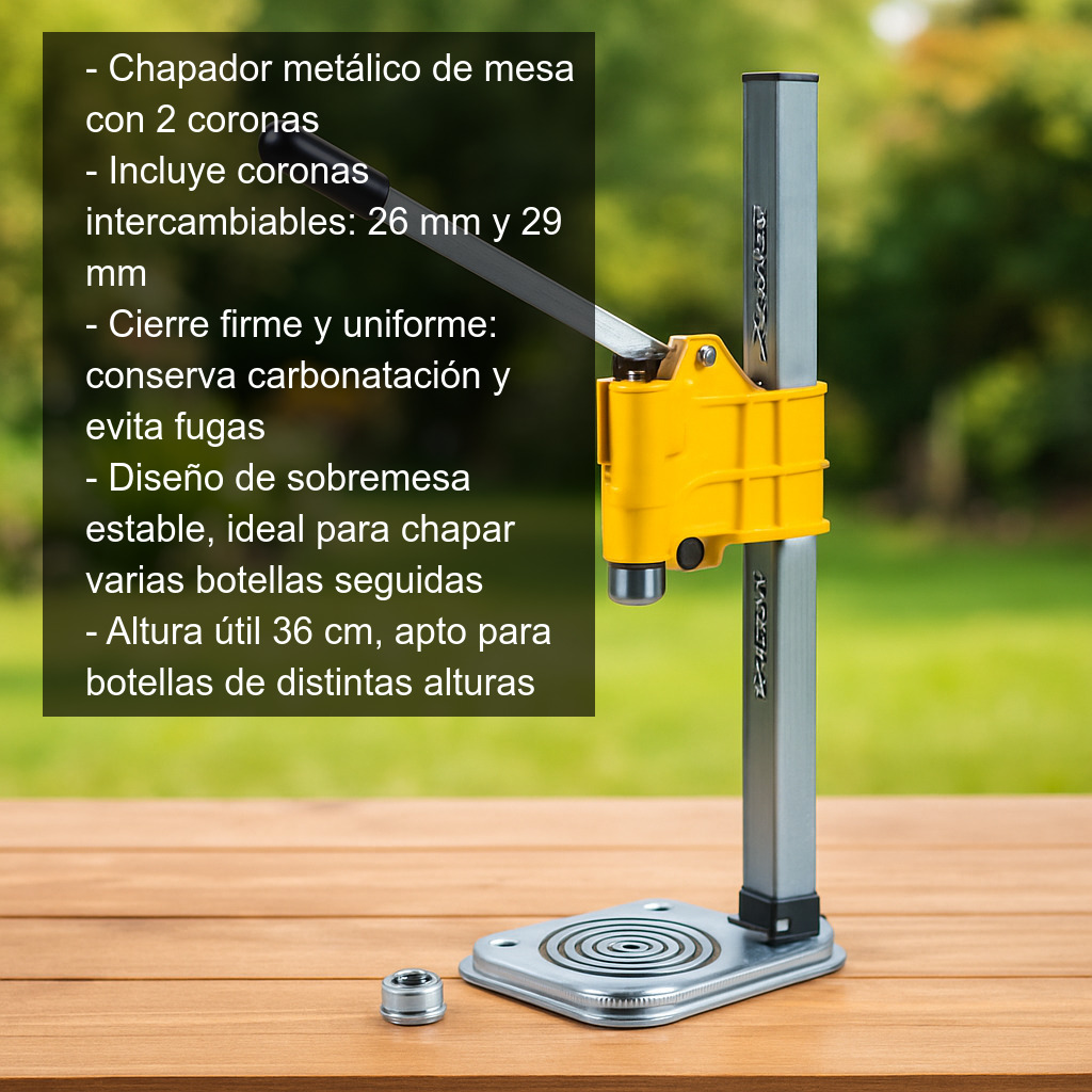 El chapador metálico de mesa con 2 coronas es una herramienta robusta y precisa para chapar botellas de forma cómoda y segura en casa o en pequeñas producciones. Ideal para cerveza artesanal, refrescos, kombucha y otras bebidas embotelladas, permite conseguir un cierre firme y uniforme para conservar mejor la carbonatación y evitar fugas.