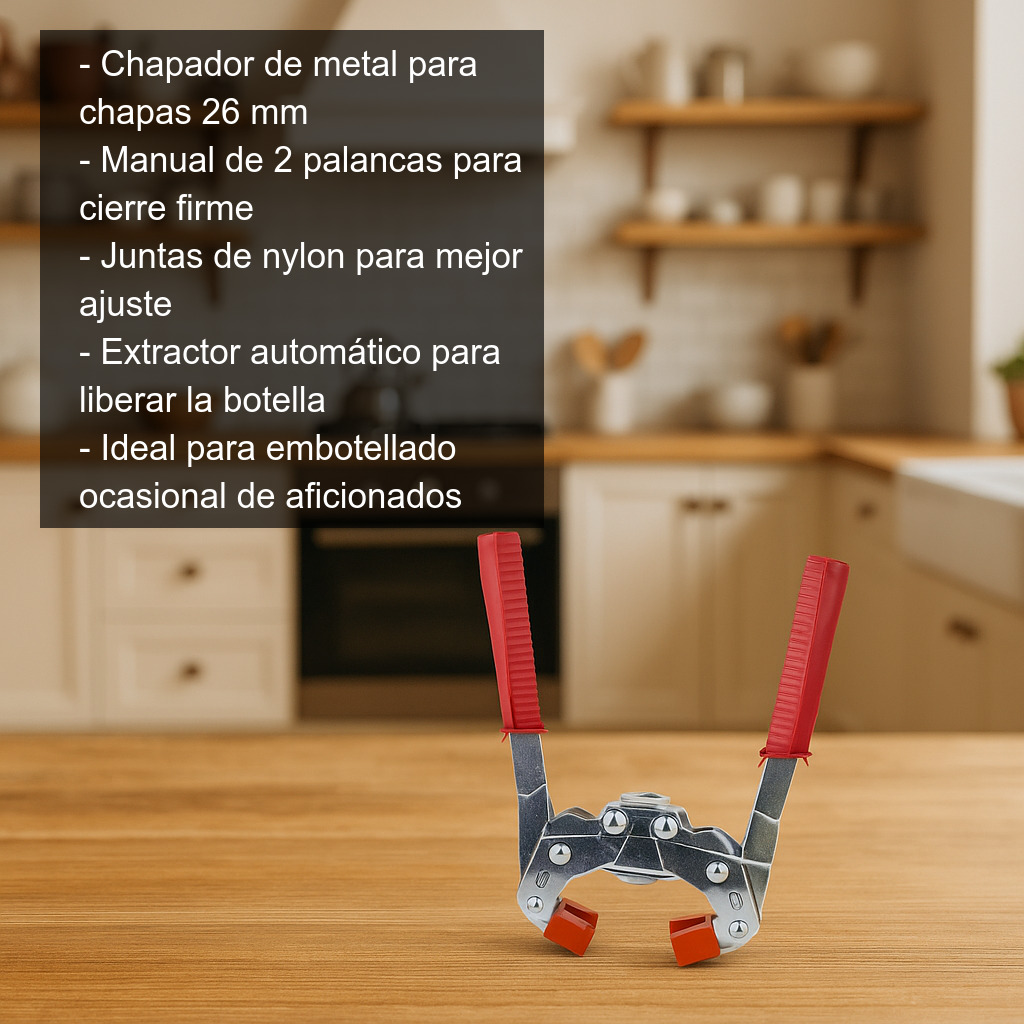 Este chapador manual de dos palancas incorpora una cabeza con corona compatible con chapas de 26 mm, además de juntas de nylon que ayudan a mejorar el ajuste durante el chapado. Incluye también un extractor automático que facilita la liberación de la botella una vez colocada la chapa, haciendo el proceso más cómodo y rápido.