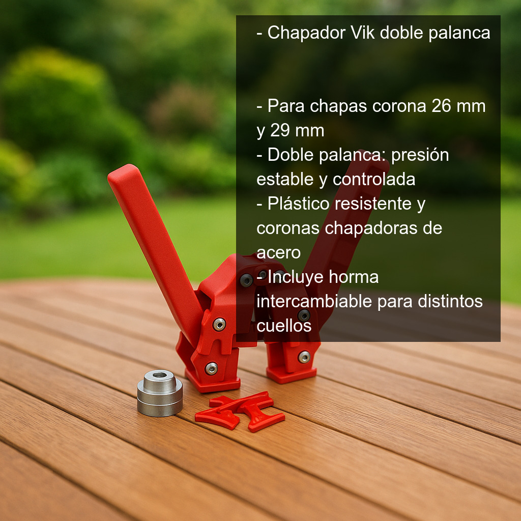 El chapador Vik de doble palanca es una herramienta práctica y fiable para chapar botellas con chapas corona de 26 mm y 29 mm. Es ideal para quienes embotellan en casa (cerveza artesanal, refrescos caseros, kombucha u otras bebidas) y buscan un chapador cómodo, resistente y con una excelente relación calidad-precio. Su diseño en color rojo combina una estructura de plástico muy resistente con coronas chapadoras de acero para un cierre seguro.