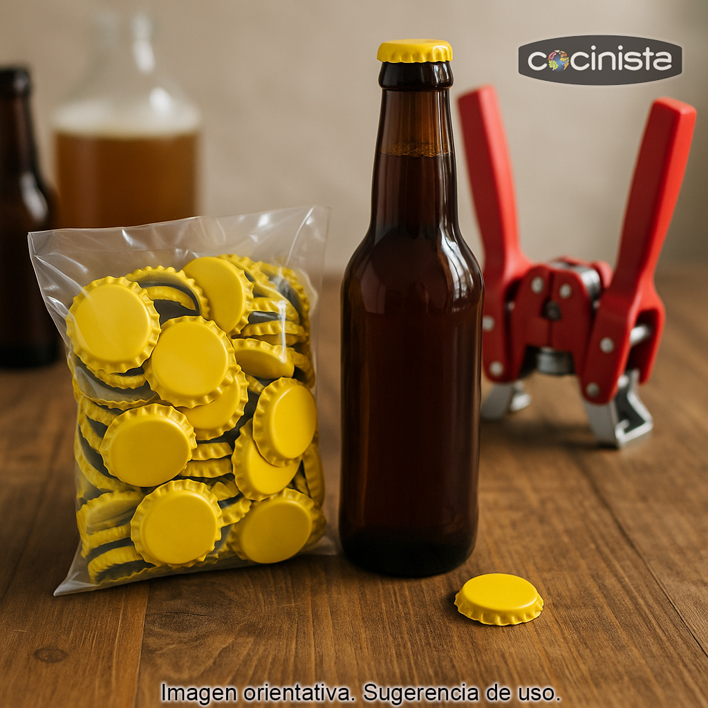 Su medida estándar de 26 mm las hace compatibles con la mayoría de botellas de cerveza con cuello de 26 mm (formato habitual en botellas estándar). Para colocarlas correctamente necesitarás un chapador/encapsuladora compatible y una campana (corona) de 26 mm.