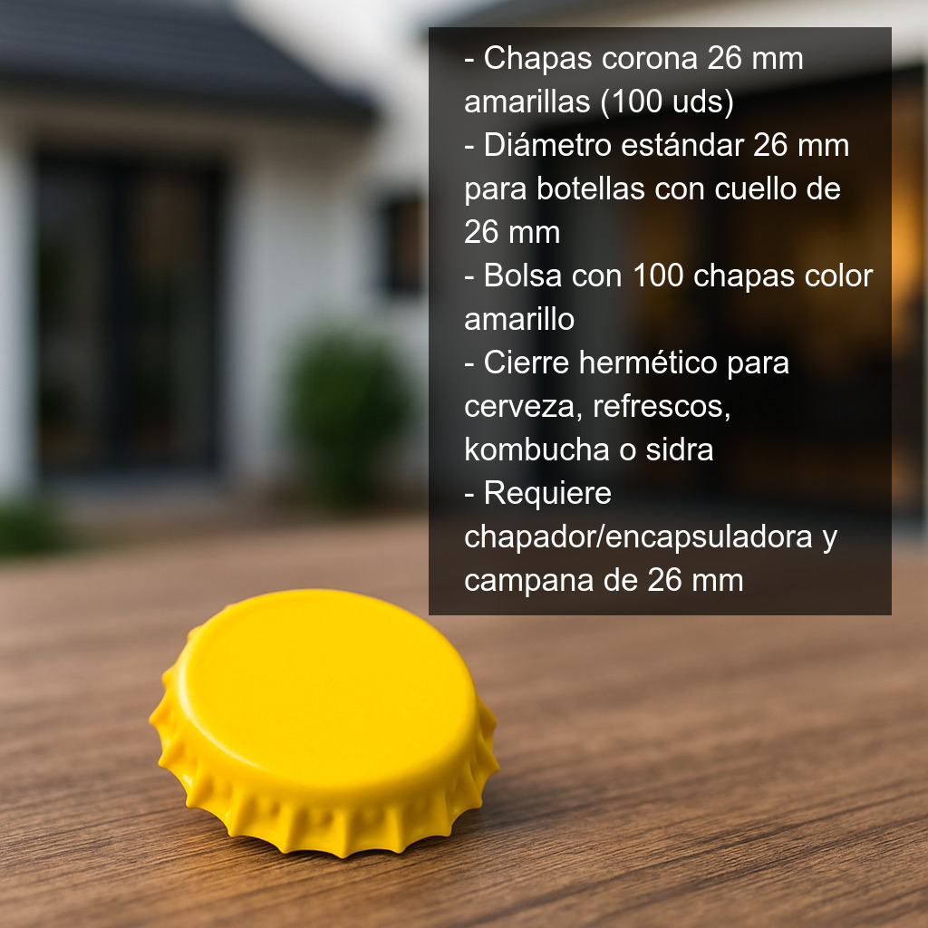 Si buscas chapas amarillas de 26 mm para identificar tus lotes o dar un acabado llamativo a tus botellas, este pack de 100 unidades es una opción práctica y económica.