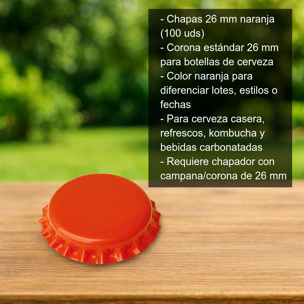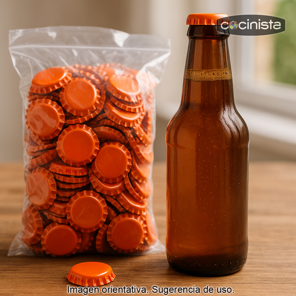 Chapas de 26 mm color naranja para el cierre de botellas de cerveza con cuello estándar de 26 mm. Ideales para embotellar cerveza casera, refrescos, kombucha u otras bebidas carbonatadas, estas chapas aportan un cierre seguro y un acabado llamativo gracias a su tono naranja, perfecto para diferenciar lotes, estilos o fechas de embotellado.