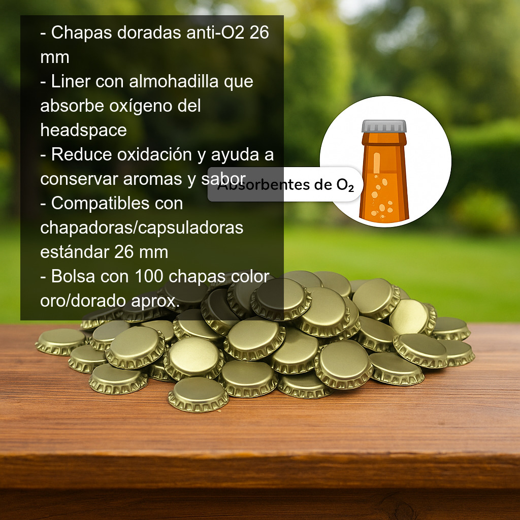 Estas chapas doradas de 26 mm anti-O2 (también conocidas como chapas corona con absorbedor de oxígeno) están diseñadas para mejorar el cierre de tus botellas y proteger la cerveza frente a la oxidación. Incorporan una almohadilla interior especial fabricada con un material capaz de absorber las moléculas de oxígeno presentes en el pequeño espacio de aire (headspace) que queda en la botella tras el embotellado. El resultado es una cerveza más estable, con mejor conservación de aromas y sabor, y una vida útil más larga.