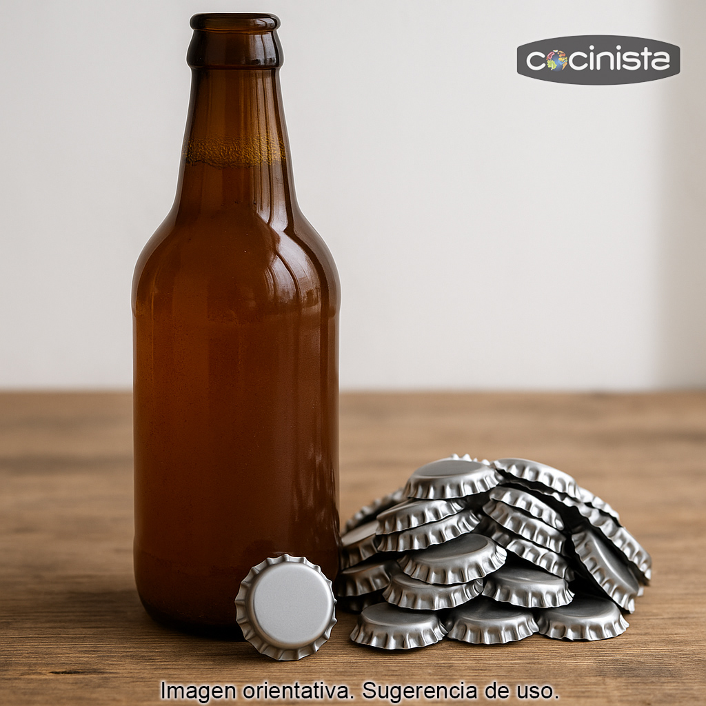 Las chapas corona plateadas de 29 mm (pack de 100 unidades) son el cierre ideal para embotellar cerveza artesanal, sidra, kombucha u otras bebidas carbonatadas en botellas grandes de 75 cl o 1 litro con boca tipo corona. Su acabado plateado ofrece un aspecto limpio y profesional, perfecto tanto para uso doméstico como para pequeñas producciones.