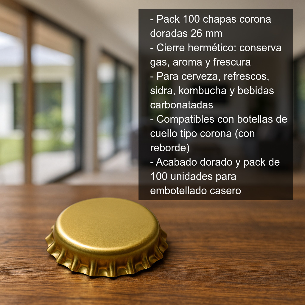 Pack de 100 chapas corona doradas de 26 mm, ideales para el embotellado casero de cerveza, refrescos, sidra, kombucha u otras bebidas carbonatadas. Estas chapas metálicas aportan un acabado elegante y profesional, y permiten un cierre hermético que ayuda a conservar el gas, el aroma y la frescura del contenido.
