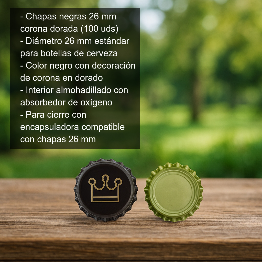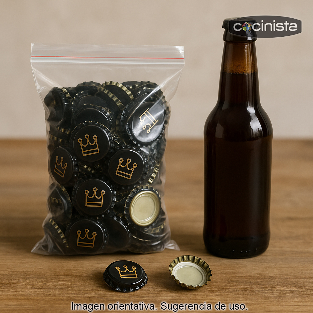 Su tamaño 26 mm es el estándar habitual para el chapado/capsulado de botellas de cerveza, por lo que resultan perfectas para embotellado casero y profesional. El color negro con el detalle dorado combina especialmente bien con etiquetas oscuras, diseños minimalistas o estilos “premium”, ayudando a mejorar la presentación final de tu producto.