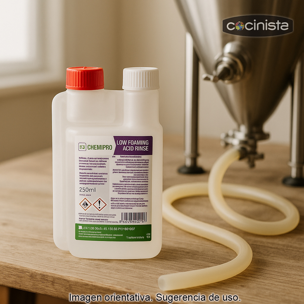 Chemipro CIP (250 ml) es un limpiador higienizante de baja formación de espuma, especialmente indicado para la industria alimentaria y de bebidas y para todo tipo de elaboraciones caseras donde se requiera una limpieza eficaz y segura del equipo. Ha sido diseñado para su uso en sistemas CIP (Cleaning In Place / limpieza en circuito), por lo que puede recircularse mediante bombas de trasiego y circuitos de limpieza sin dañarlas, facilitando una limpieza profunda en zonas de difícil acceso.