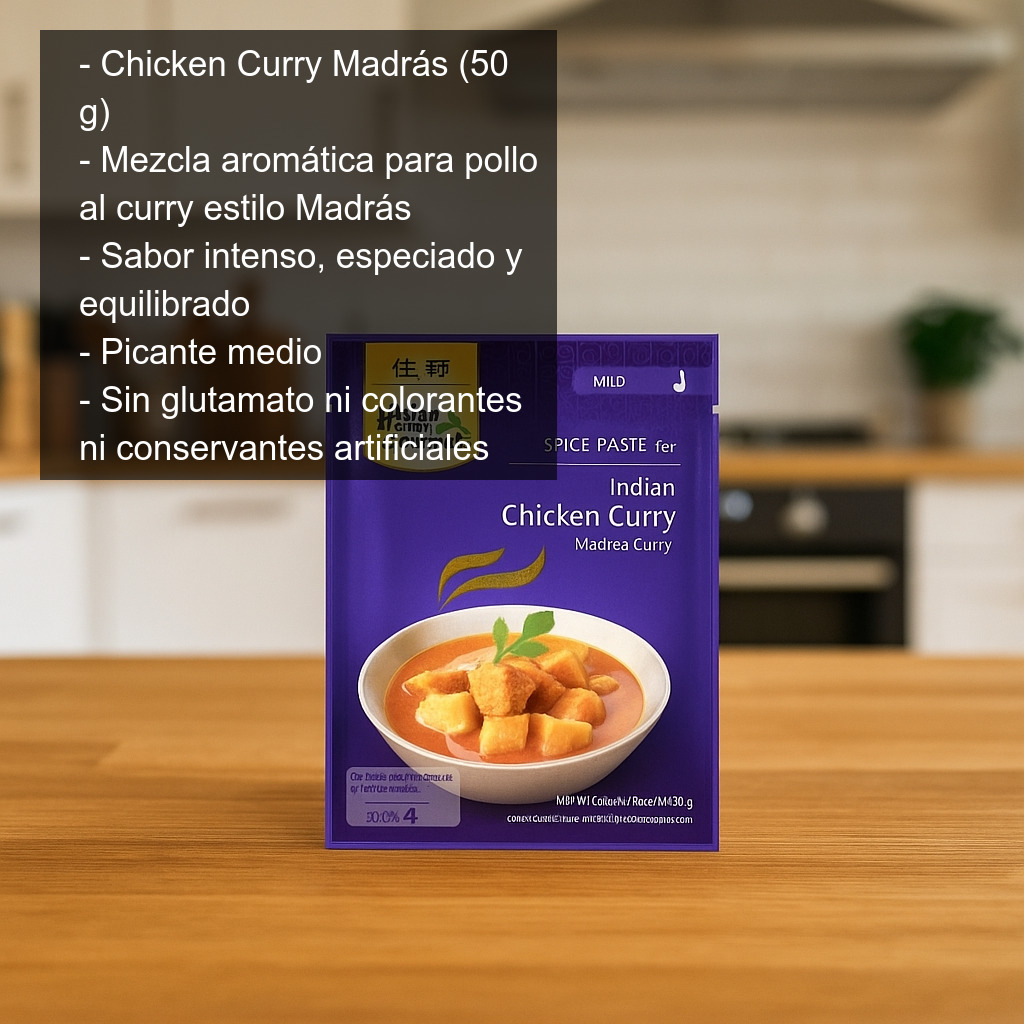 La mezcla de especias Chicken Curry Madrás (bolsa de 50 g) es un preparado aromático para cocinar un auténtico pollo al curry estilo Madrás, con un sabor intenso, especiado y equilibrado. Ideal para quienes buscan un curry casero con carácter, perfecto para acompañar con arroz basmati, pan naan o verduras salteadas.