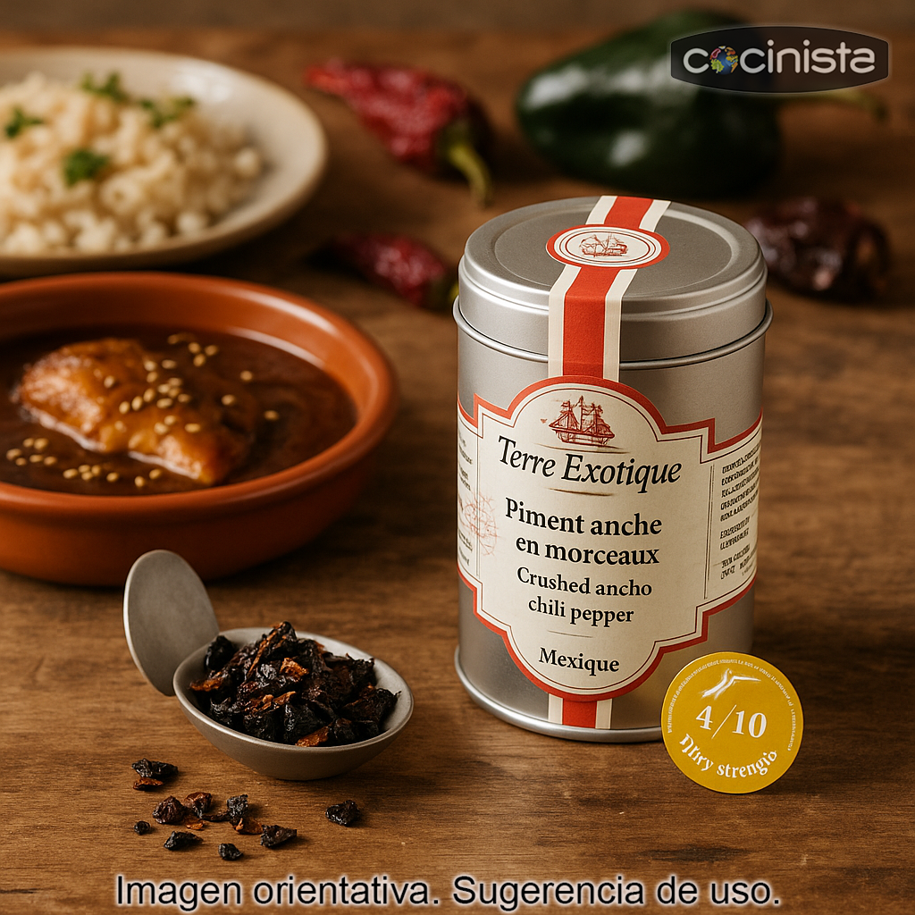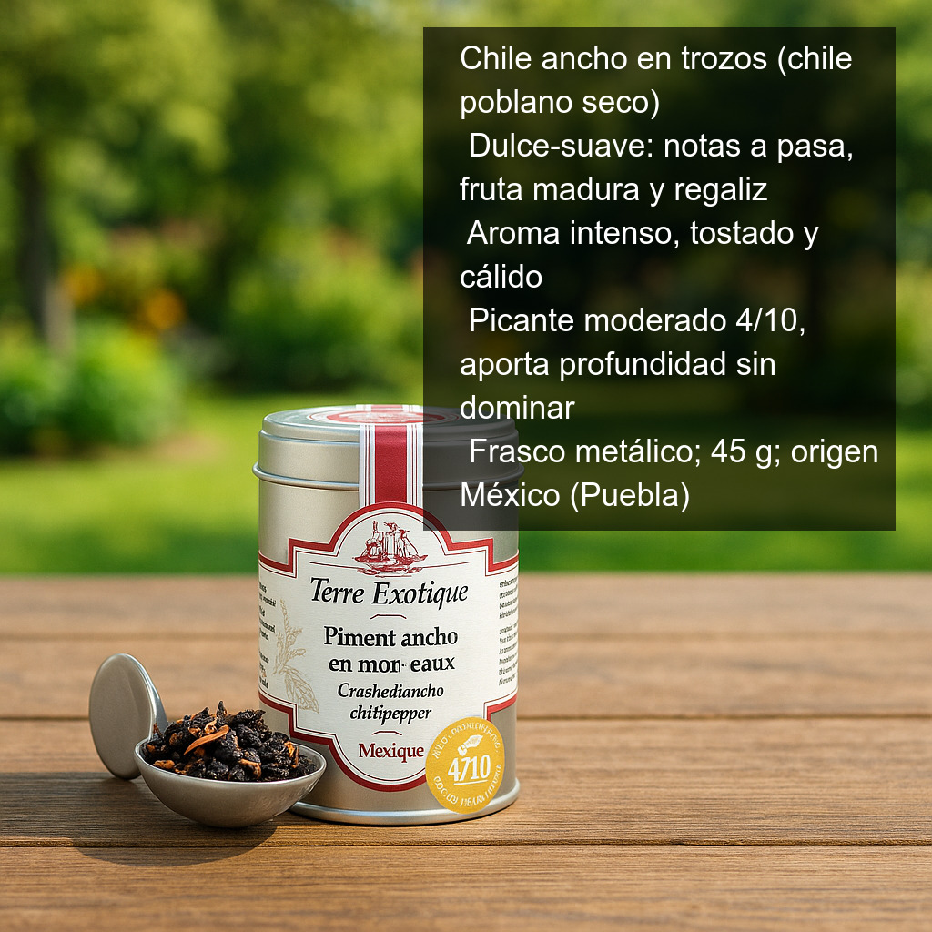 El chile ancho en trozos (también conocido como chile poblano seco) es uno de los chiles más emblemáticos de la gastronomía mexicana. Procedente de la región de Puebla (México), destaca por su perfil aromático y ligeramente dulce, con notas afrutadas que recuerdan a la pasa y un fondo sutil a regaliz. Su fragancia intensa y su sabor redondo lo convierten en un ingrediente imprescindible para dar profundidad a salsas, caldos y guisos sin dominar el plato con un picante excesivo.