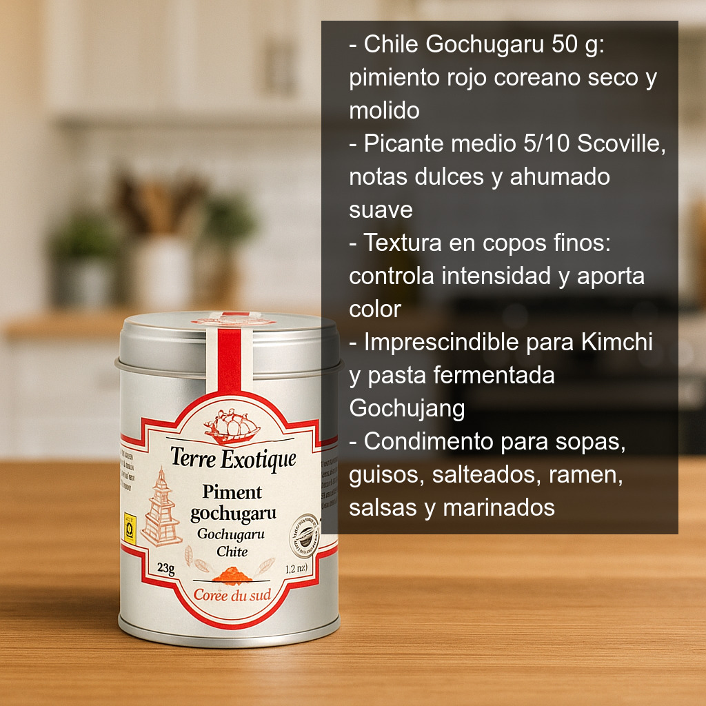 El chile Gochugaru es un pimiento rojo coreano seco y molido, imprescindible en la cocina de Corea por su sabor equilibrado: picante medio, notas ligeramente dulces y un toque ahumado muy suave. Su textura suele ser en copos finos (más que un polvo), lo que permite controlar fácilmente la intensidad y aportar color sin dominar el plato.