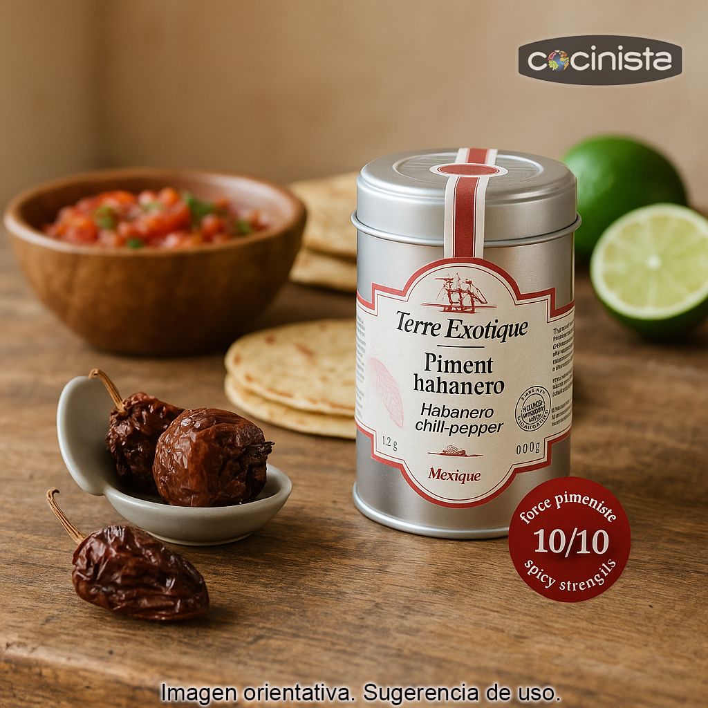 El chile habanero es una de las variedades de chile más picantes de México y un imprescindible para quienes buscan un picante intenso, aromático y persistente. Su sabor no es solo fuego: el habanero destaca por sus notas frutales y un aroma característico que realza salsas, marinados y guisos con un toque auténticamente mexicano. En la escala de picante de Terre Exotique, este habanero merece un 10/10, por lo que se recomienda usarlo en cantidades muy pequeñas o reservarlo para amantes del picante más explosivo.