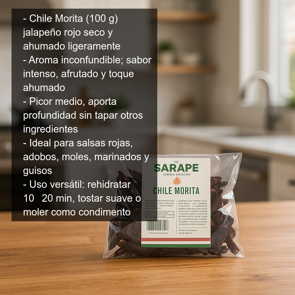 El Chile Morita (100 g) es un chile jalapeño rojo maduro que se seca y se ahúma ligeramente, dando como resultado un ingrediente con un aroma inconfundible y un sabor intenso, afrutado y con un toque ahumado muy característico de la cocina mexicana. Su picor es medio (generalmente más suave que otros chiles secos), por lo que aporta profundidad y carácter sin tapar el resto de ingredientes.