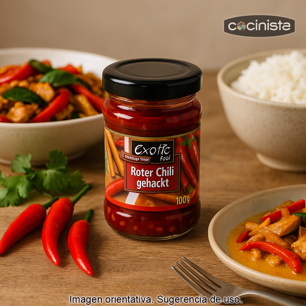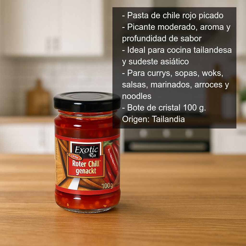 La pasta de chile rojo picado es un ingrediente imprescindible para quienes buscan aportar a sus recetas un toque picante moderado, aroma y profundidad de sabor. Elaborada a partir de chiles rojos finamente picados, esta pasta es ideal para cocinar platos de la gastronomía tailandesa y del sudeste asiático, así como para dar carácter a salteados, salsas, marinados y guisos de cualquier cocina.