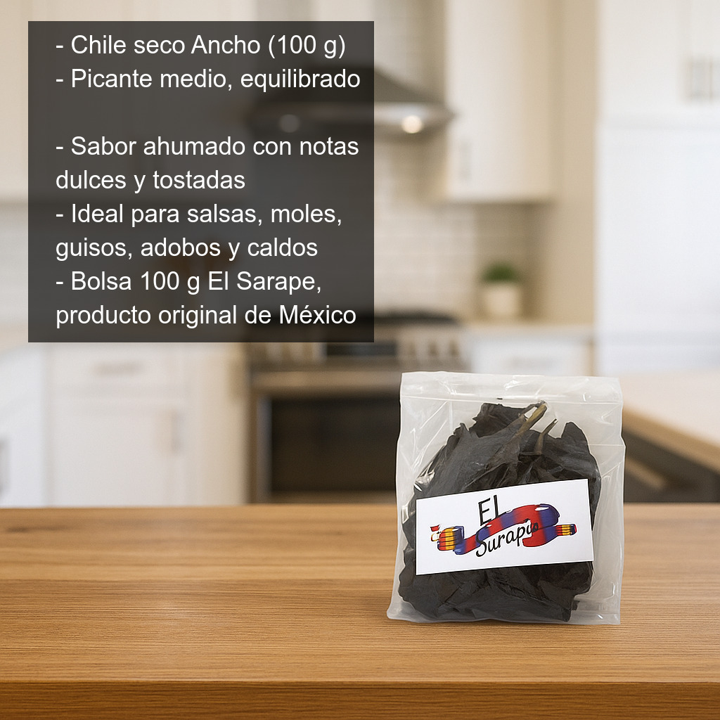 Este chile ancho deshidratado se presenta en bolsa de 100 g, ideal para uso doméstico y para recetas que requieren varios chiles. De la marca El Sarape, es un producto original de México.