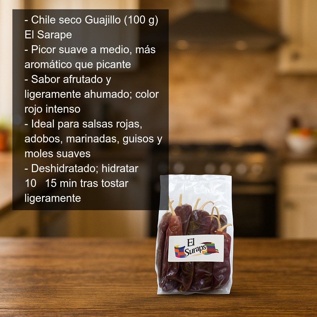 Este chile guajillo deshidratado se presenta en bolsa de 100 g, ideal para tener siempre a mano en la despensa y preparar recetas mexicanas con sabor auténtico. Producto de México de la marca El Sarape.