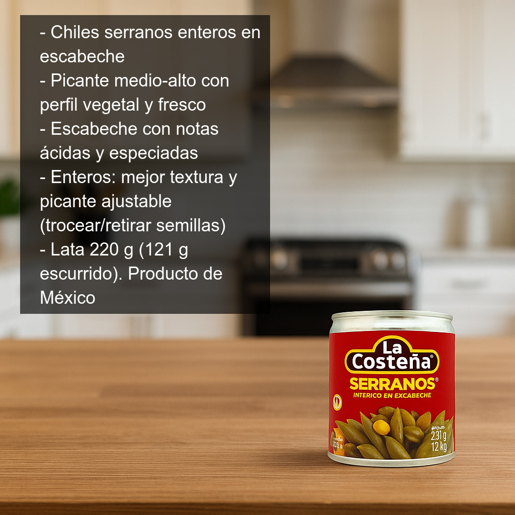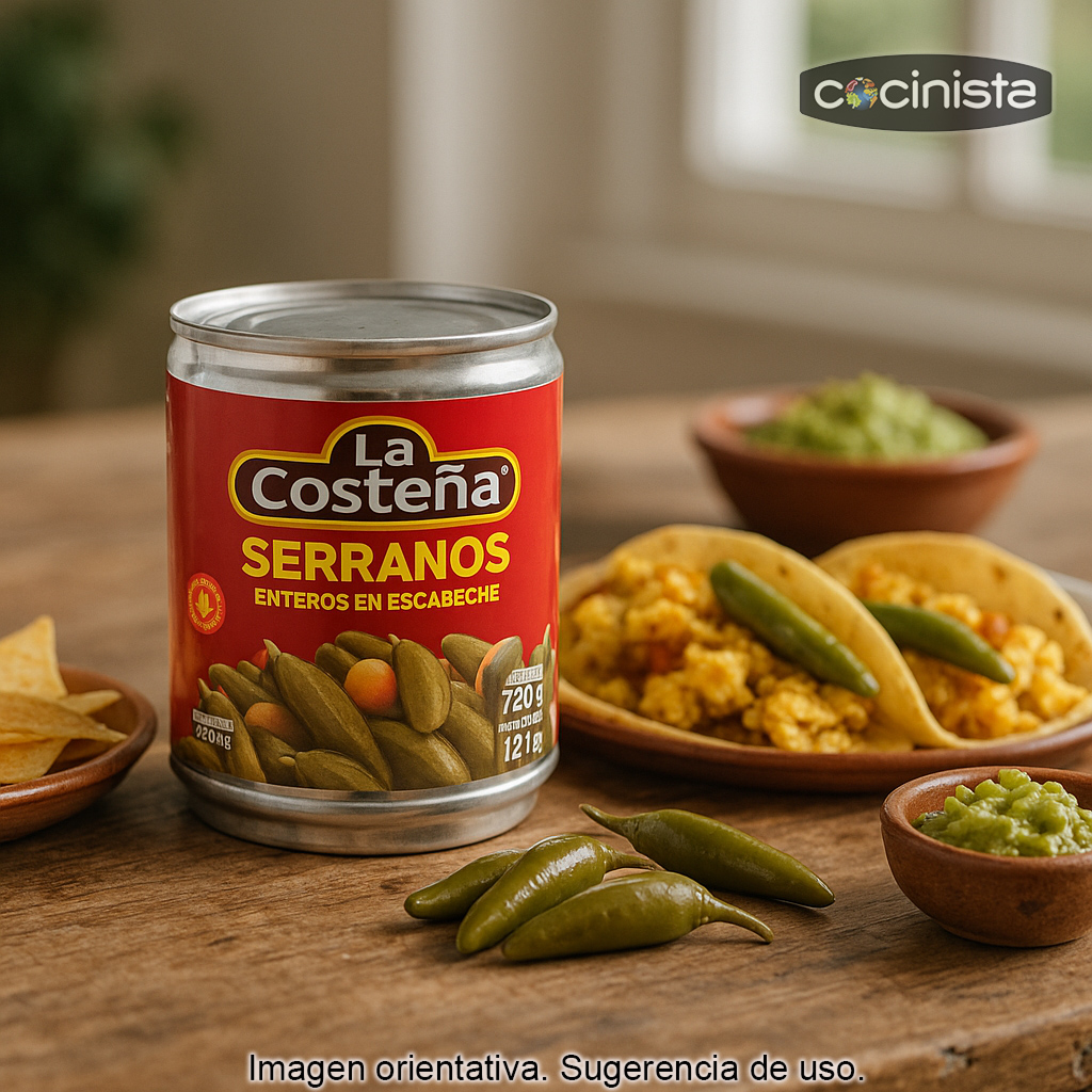 Los chiles serranos enteros en escabeche son un imprescindible de la cocina mexicana para quienes buscan un picante medio-alto con mucho sabor. El chile serrano recibe su nombre por su origen en la Sierra de Puebla (México) y destaca por su perfil vegetal y fresco, que en esta versión se potencia gracias al escabeche, aportando notas ácidas y especiadas ideales para realzar todo tipo de platos.