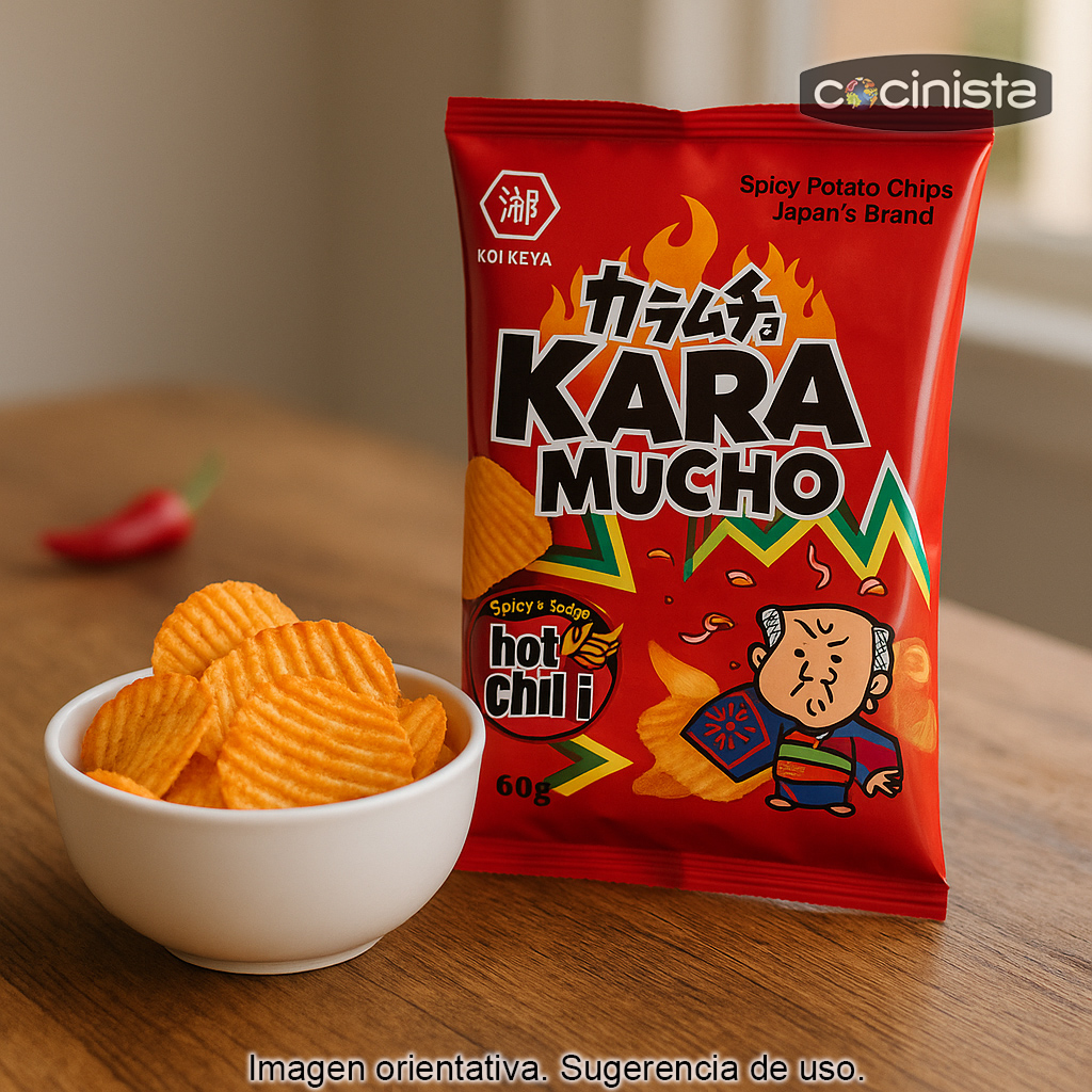 Estas chips de patata picante (conocidas como “Karamucho” por su fabricante japonés Koikeya) destacan por su corte ondulado, que aporta una textura extra crujiente y una mejor adherencia del sazonado. El resultado es un bocado con auténtico sabor a patata y un picante equilibrado gracias a la guindilla, perfecto para disfrutar en cualquier momento.