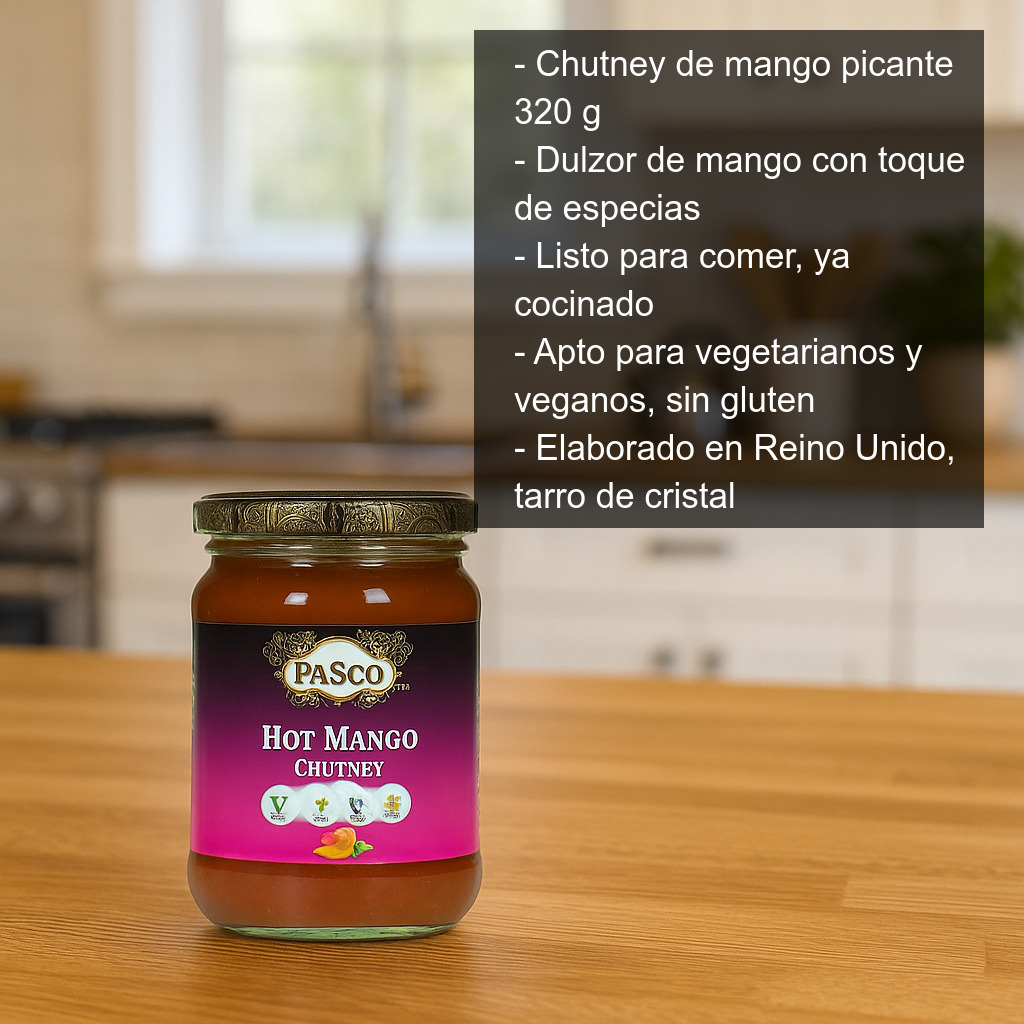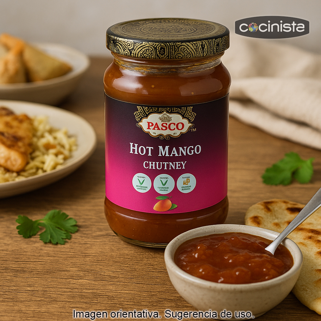 Este chutney combina una base afrutada y aromática con un picante agradable que realza los sabores sin enmascararlos. Su textura es típica del chutney: densa, con cuerpo y fácil de untar o servir como acompañamiento.