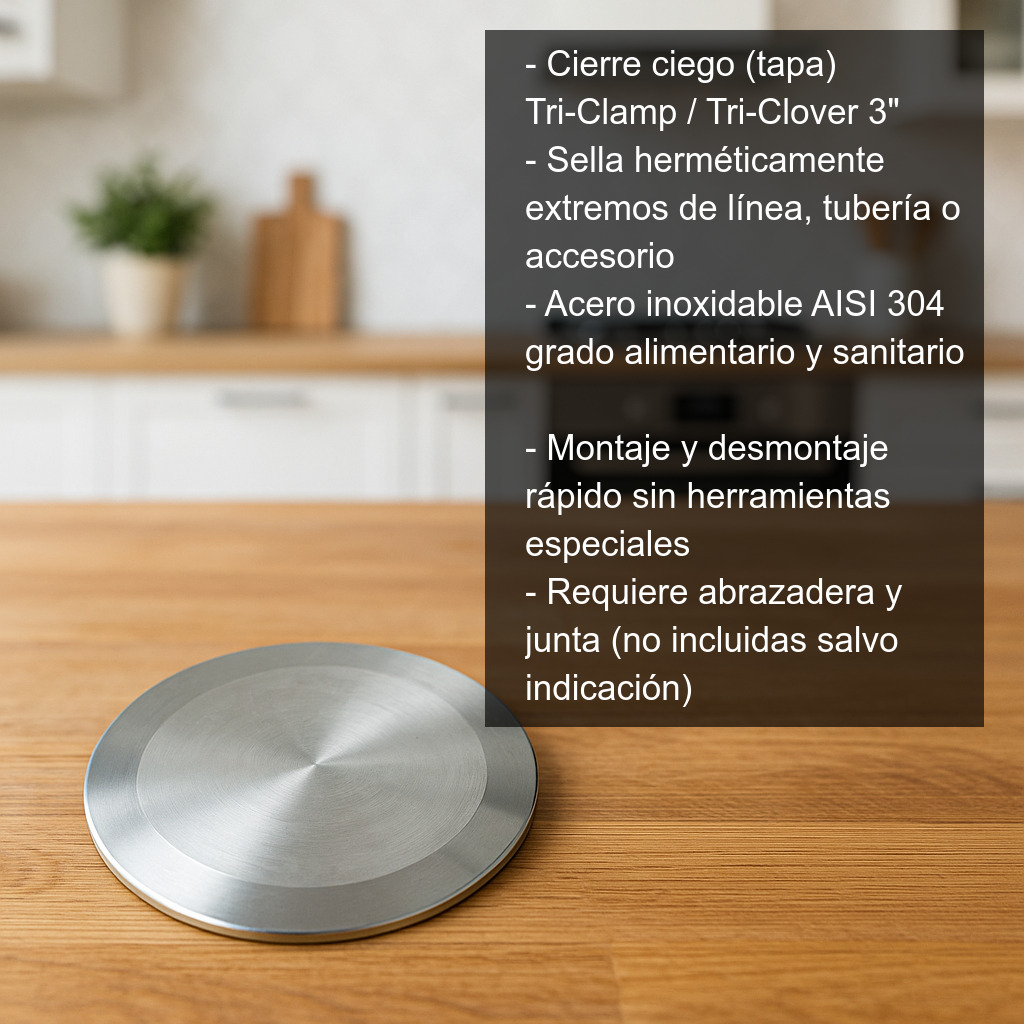 Cierre ciego (tapa) para adaptador Tri-Clamp / Tri-Clover de 3", ideal para cerrar herméticamente el extremo de una línea, tubería o accesorio con conexión sanitaria. Este cierre para tri-clamp de 3 pulgadas es una solución práctica y segura para sellar instalaciones durante paradas, limpiezas, pruebas de estanqueidad o cuando necesitas dejar una salida inutilizada temporalmente.