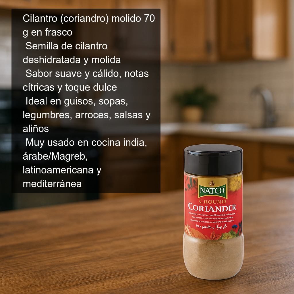 El cilantro molido (también conocido como coriandro molido) es una especia imprescindible para dar aroma y profundidad a tus recetas, con la comodidad de tenerlo ya en polvo. Se obtiene a partir de la semilla de cilantro deshidratada y molida, y su perfil es muy distinto al de la hoja fresca: resulta más suave, cálido y sutil, con notas ligeramente cítricas y un toque dulce que redondea salsas, guisos y marinados.