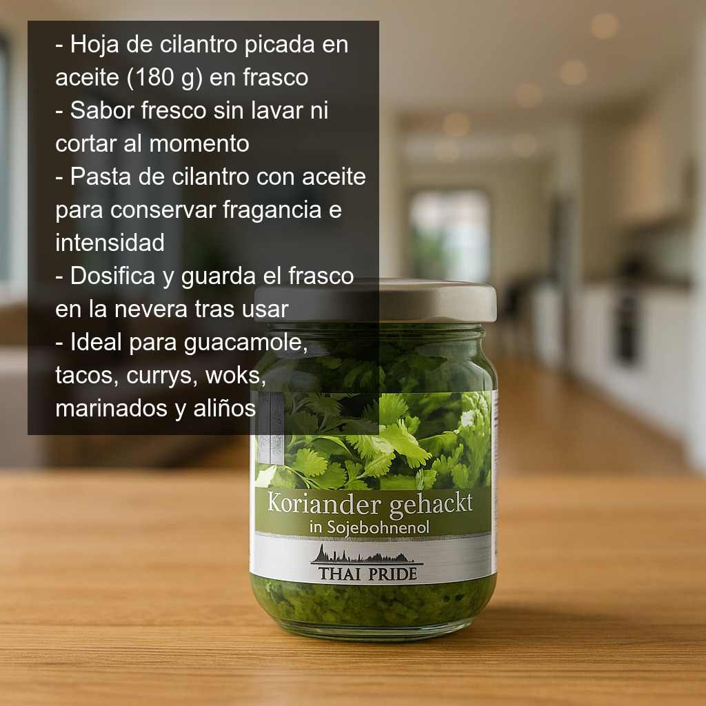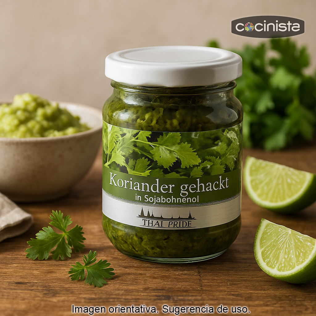 Este cilantro picado en aceite se presenta en frasco de cristal con 180 g de mezcla, un formato práctico para conservar en la nevera y dosificar fácilmente cuando lo necesites.