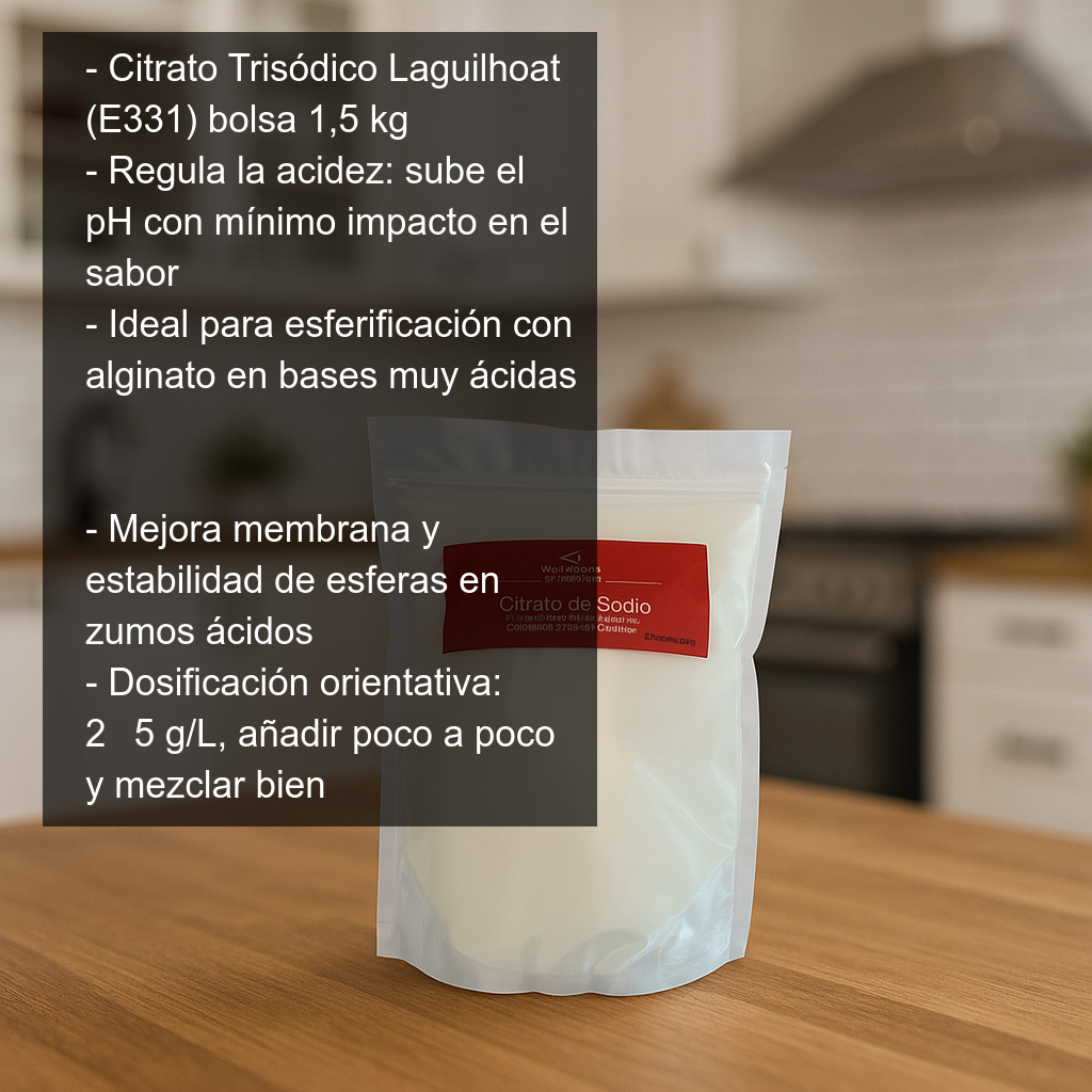 El Citrato Trisódico Laguilhoat se presenta en bolsa de 1,5 kg, un formato ideal para uso frecuente en cocina profesional, obradores y aplicaciones de gastronomía creativa.