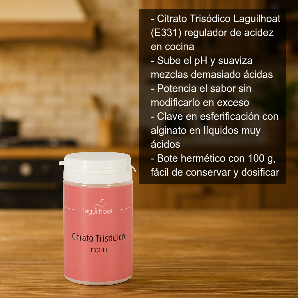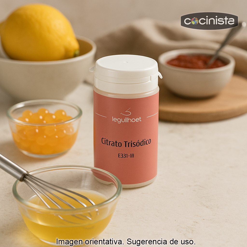 El citrato trisódico (también conocido como citrato de sodio, aditivo alimentario E331) es un ingrediente muy utilizado en cocina y en la industria alimentaria por su capacidad para regular la acidez y potenciar el sabor sin modificarlo en exceso. En gastronomía moderna es especialmente apreciado como corrector de pH para preparar elaboraciones técnicas con resultados más estables.