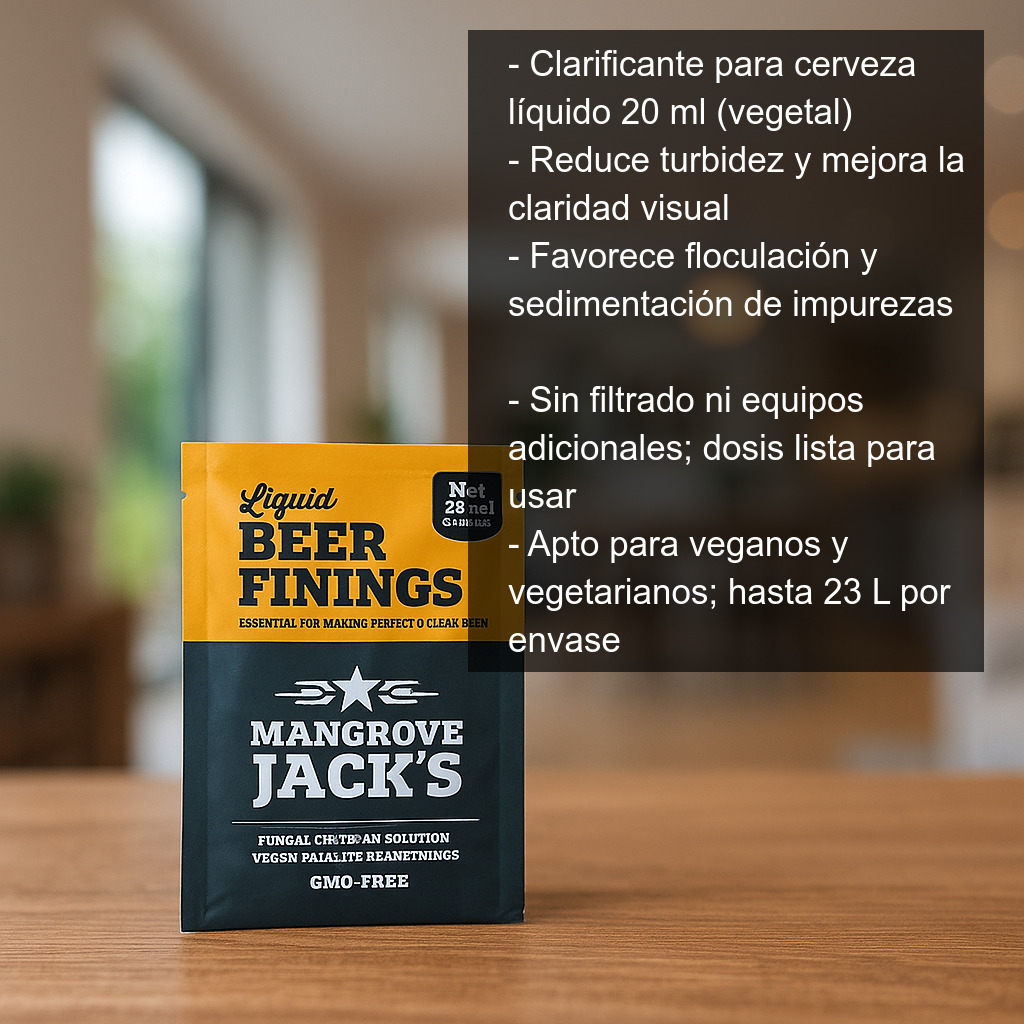 Este clarificante para cerveza en formato líquido (20 ml) está elaborado a base de ingredientes de origen vegetal y está diseñado para mejorar de forma sencilla y natural el aspecto final de tus elaboraciones. Su acción favorece la floculación y la posterior sedimentación de partículas en suspensión (levaduras y otras impurezas), ayudando a obtener una cerveza más limpia, brillante y con menos turbidez, sin necesidad de recurrir a sistemas de filtrado.