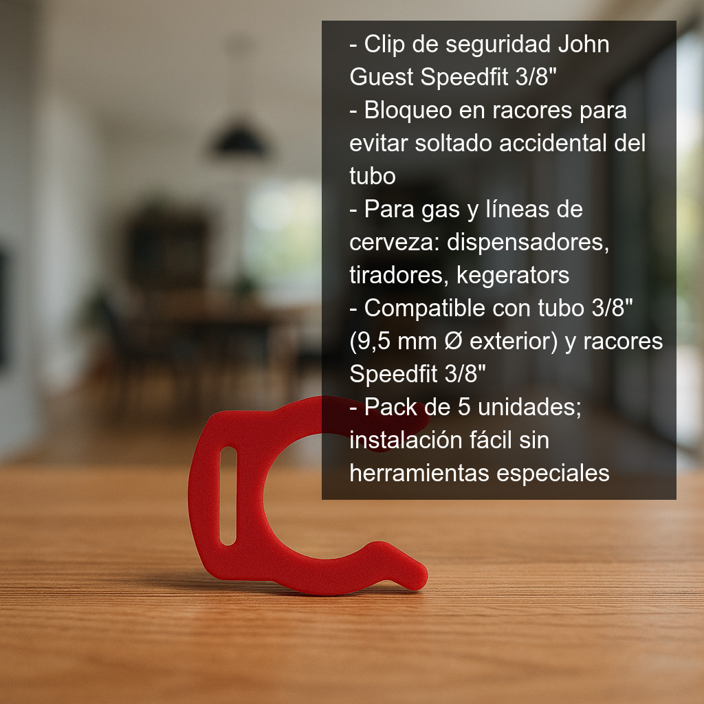 Es especialmente recomendable en montajes de líneas de gas y líneas de cerveza (dispensadores, tiradores, kegerators, sistemas de barril, etc.), donde una desconexión involuntaria puede provocar fugas, pérdida de presión o interrupciones del servicio. Con este clip, el racor queda “asegurado” para ofrecer una conexión más estable y tranquila.