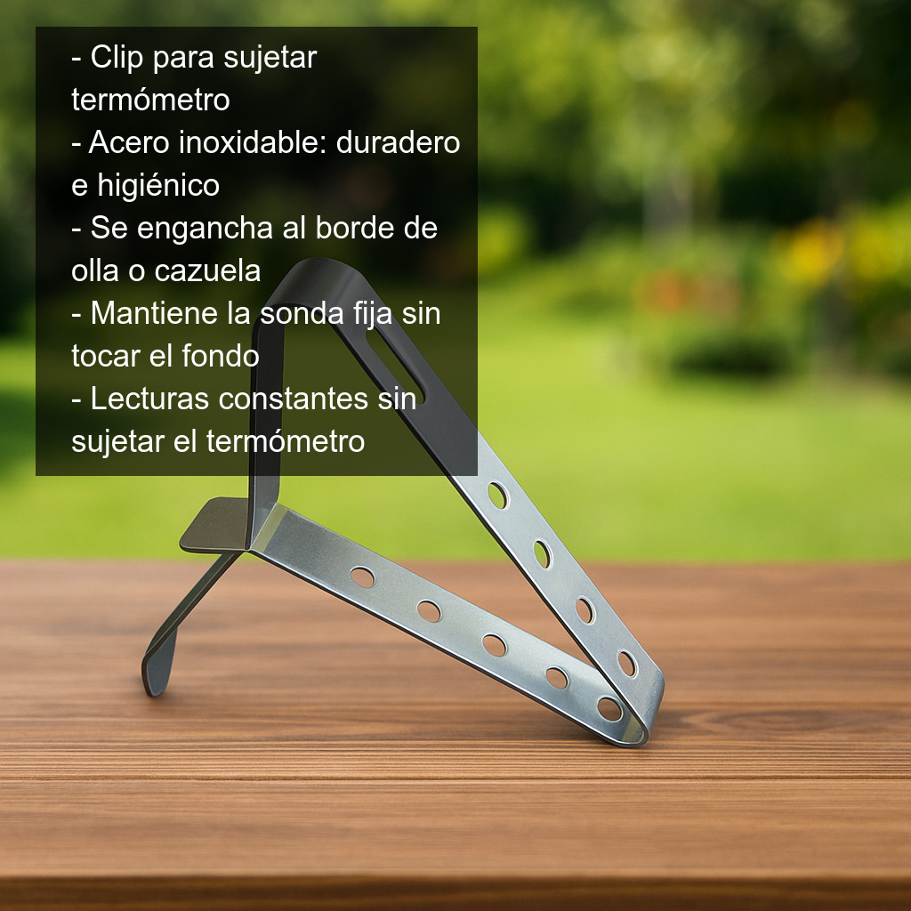 Este clip para sujetar termómetro es un accesorio práctico y resistente que te permite mantener el sensor de un termómetro digital en su sitio mientras cocinas. Fabricado en acero inoxidable, se fija de forma rápida y segura al borde de cualquier olla, cazuela o cacerola, dejando el termómetro estable para obtener una lectura de temperatura constante sin necesidad de sujetarlo con la mano.