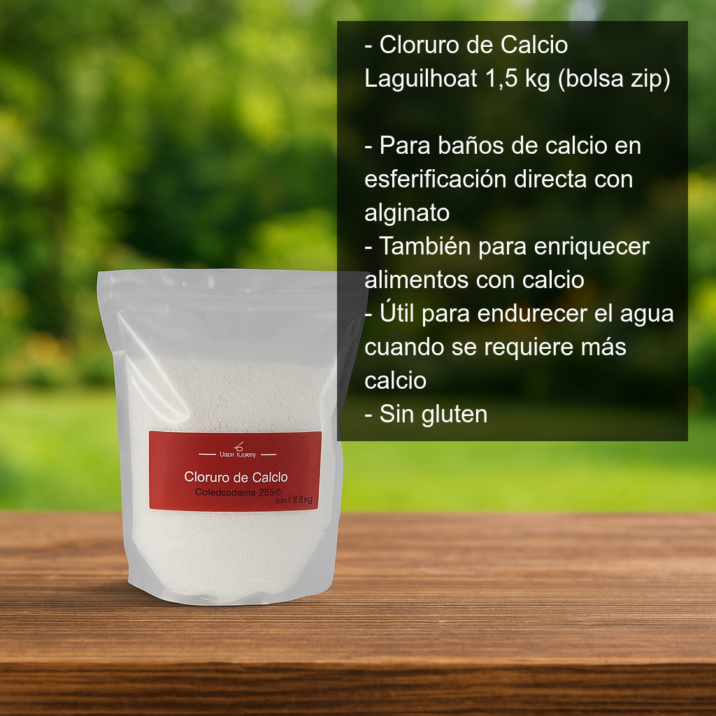 Este cloruro de calcio Laguilhoat se presenta en formato 1,5 kg en práctica bolsa zip, ideal para un uso frecuente en cocina profesional, obradores, coctelería o para aficionados avanzados que trabajan con esferificaciones de forma habitual.