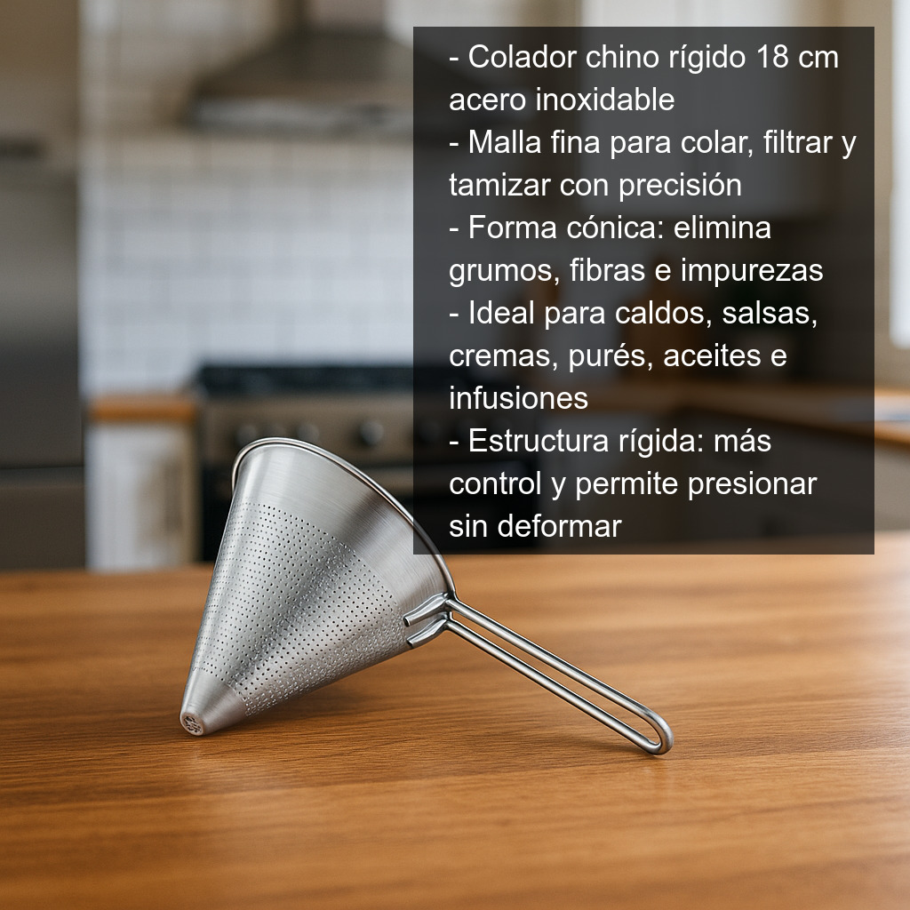 Colador chino rígido de 18 cm fabricado en acero inoxidable, un utensilio esencial para quienes buscan acabados finos y resultados consistentes en cocina. Gracias a su forma cónica y a su malla fina, permite colar, filtrar y tamizar con gran precisión, eliminando grumos, fibras e impurezas para obtener texturas suaves y homogéneas.