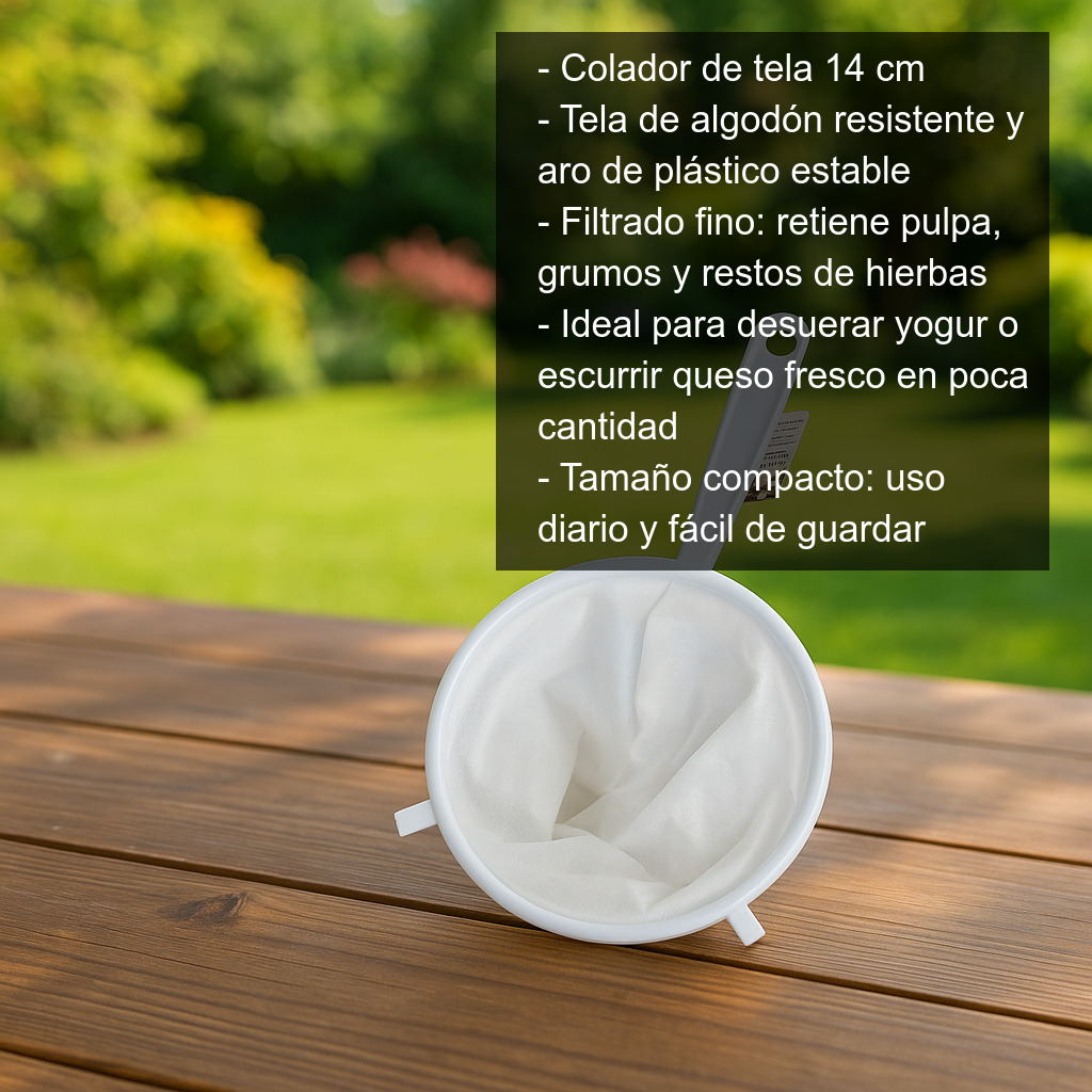 Colador de tela de 14 cm de diámetro, perfecto para colar pequeñas cantidades de líquido y para desuerar yogur o queso fresco en porciones reducidas. Es un utensilio muy práctico para quienes buscan resultados más finos al filtrar y separar sólidos de líquidos en preparaciones caseras.