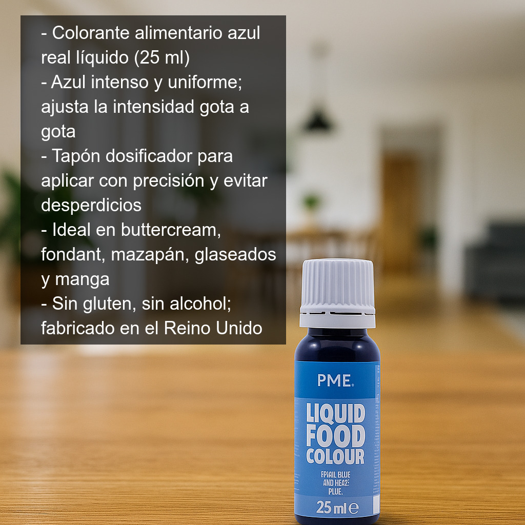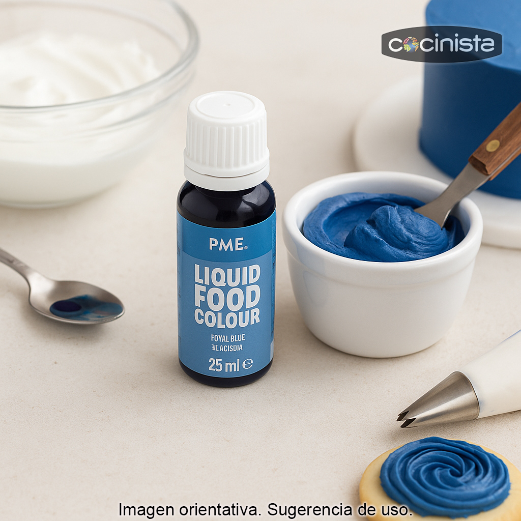 Colorante alimentario azul real (25 ml) en formato líquido, ideal para dar un tono azul intenso y elegante a tus elaboraciones de repostería creativa. Este colorante es perfecto para conseguir acabados uniformes y un color vibrante en decoraciones y masas, ajustando la intensidad gota a gota.