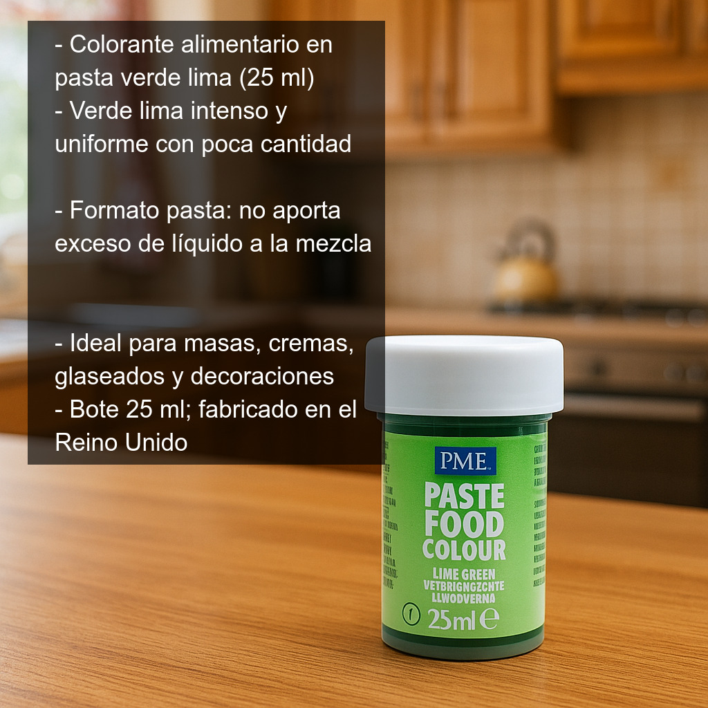 Colorante alimentario en pasta color verde lima (25 ml), ideal para dar un tono verde lima intenso y uniforme a tus elaboraciones de repostería y pastelería creativa. Su formato en pasta permite obtener colores vibrantes con muy poca cantidad, sin aportar exceso de líquido a la mezcla, por lo que es perfecto para preparaciones en las que la textura es importante.