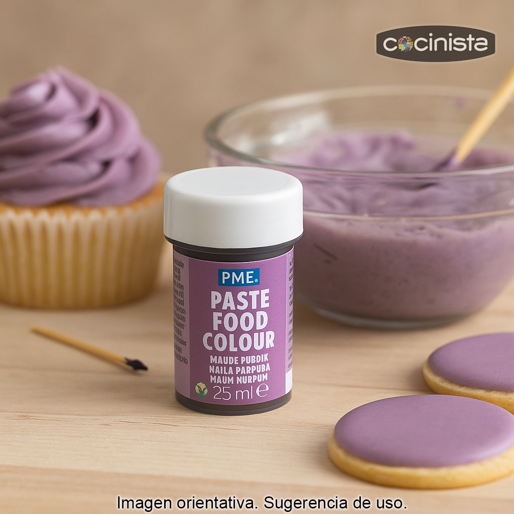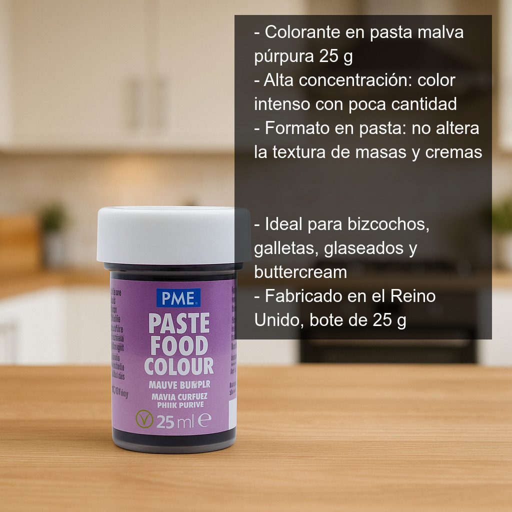 Colorante alimentario en pasta malva púrpura (25 g), perfecto para dar un tono elegante y uniforme a tus elaboraciones de repostería y pastelería creativa. Su formato en pasta ofrece un color intenso con muy poca cantidad, ayudándote a conseguir acabados profesionales sin alterar la textura de tus mezclas.