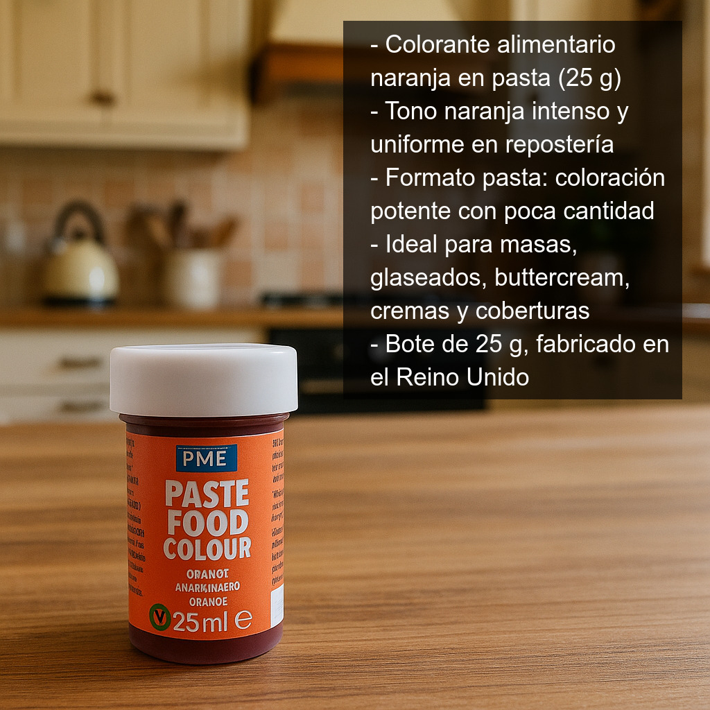 Colorante alimentario naranja en pasta (25 g) de calidad alimentaria, ideal para dar un tono naranja intenso y uniforme a tus elaboraciones de repostería y pastelería. Su formato en pasta permite una coloración potente con muy poca cantidad, ayudándote a conseguir acabados vivos sin alterar en exceso la textura de la mezcla.
