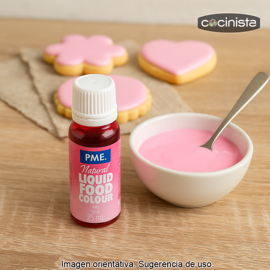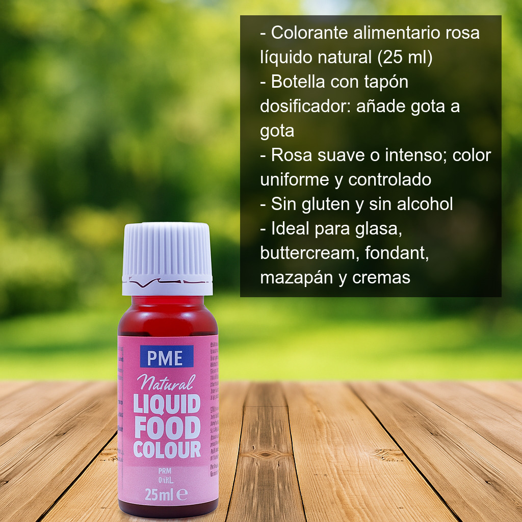 Colorante alimentario rosa líquido (25 ml) elaborado exclusivamente con colorantes naturales, ideal para dar un tono rosa suave o intenso a tus elaboraciones de repostería creativa. Su formato en botellita con tapón dosificador permite añadir la cantidad exacta gota a gota, logrando un color uniforme y controlado.
