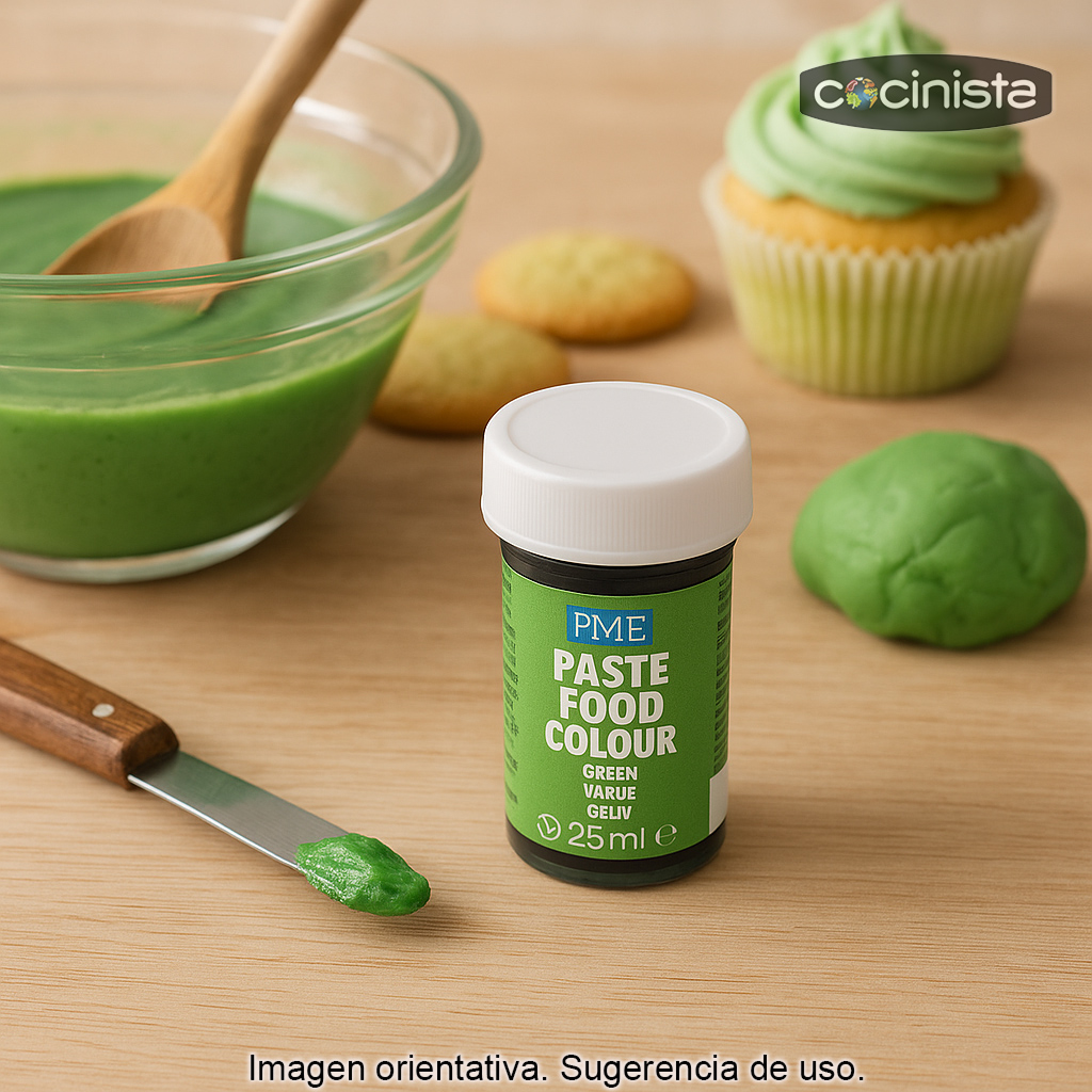 Aporta un tono verde intenso y uniforme a tus elaboraciones con este colorante alimentario en pasta, perfecto para conseguir acabados profesionales sin alterar la textura de la mezcla. Su formato concentrado permite obtener desde un verde suave hasta un verde vibrante con muy poca cantidad, ideal tanto para repostería creativa como para decoración.