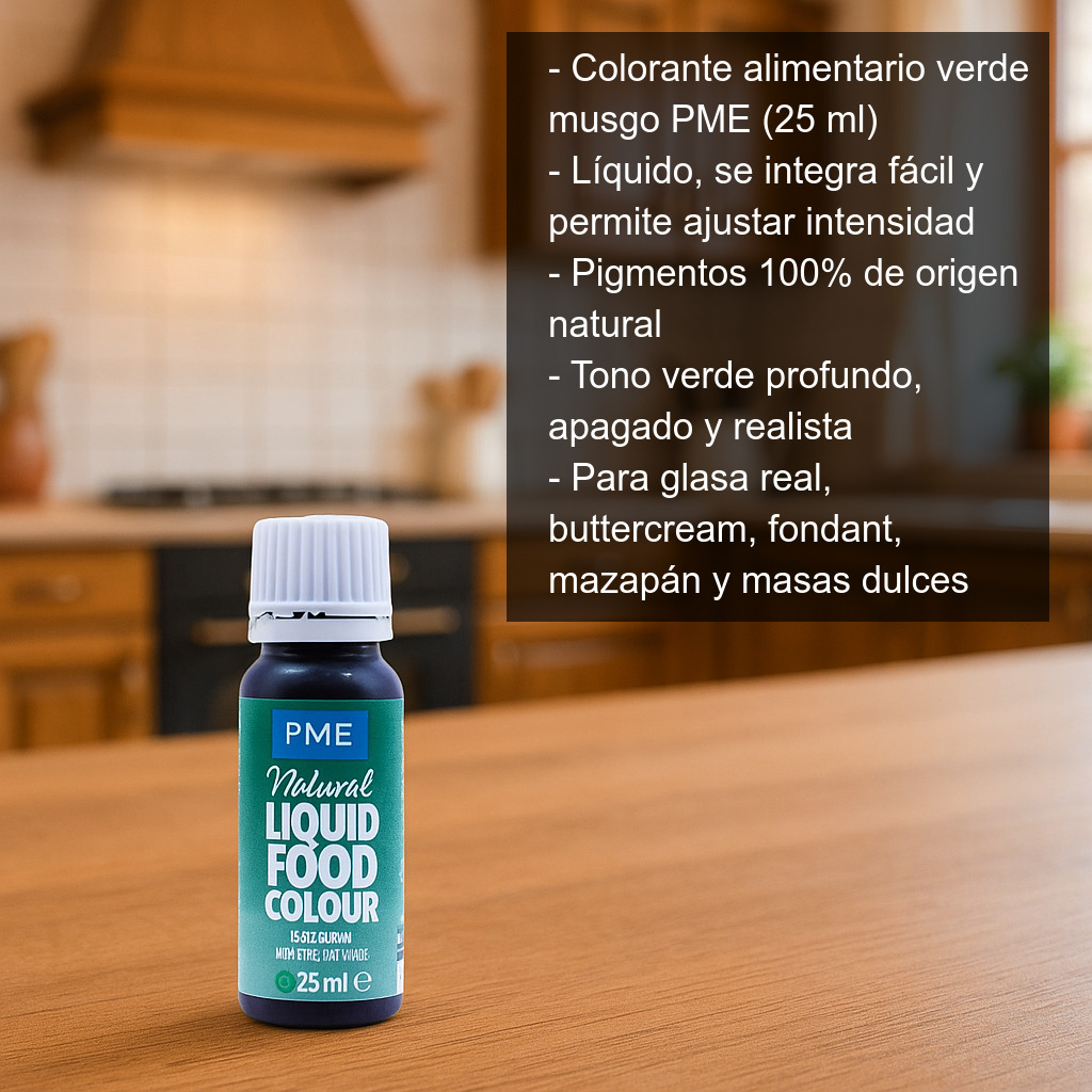 Consigue un acabado natural y elegante en tus elaboraciones con el colorante alimentario verde musgo de PME. Este colorante alimentario líquido está elaborado exclusivamente con pigmentos de origen natural, ideal para dar un tono verde profundo, apagado y realista a tus creaciones de repostería creativa y cocina.