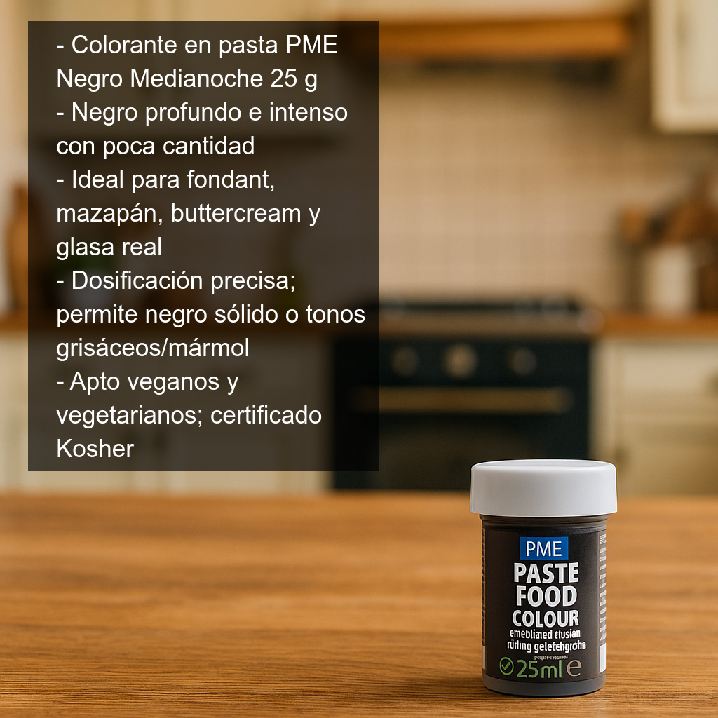 Consigue un negro profundo e intenso en tus elaboraciones con el colorante concentrado en pasta PME Negro Medianoche (25 g). Este colorante alimentario en gel/pasta está diseñado para aportar colores vivos, uniformes y de gran intensidad con muy poca cantidad, por lo que es ideal para repostería creativa y decoración profesional.