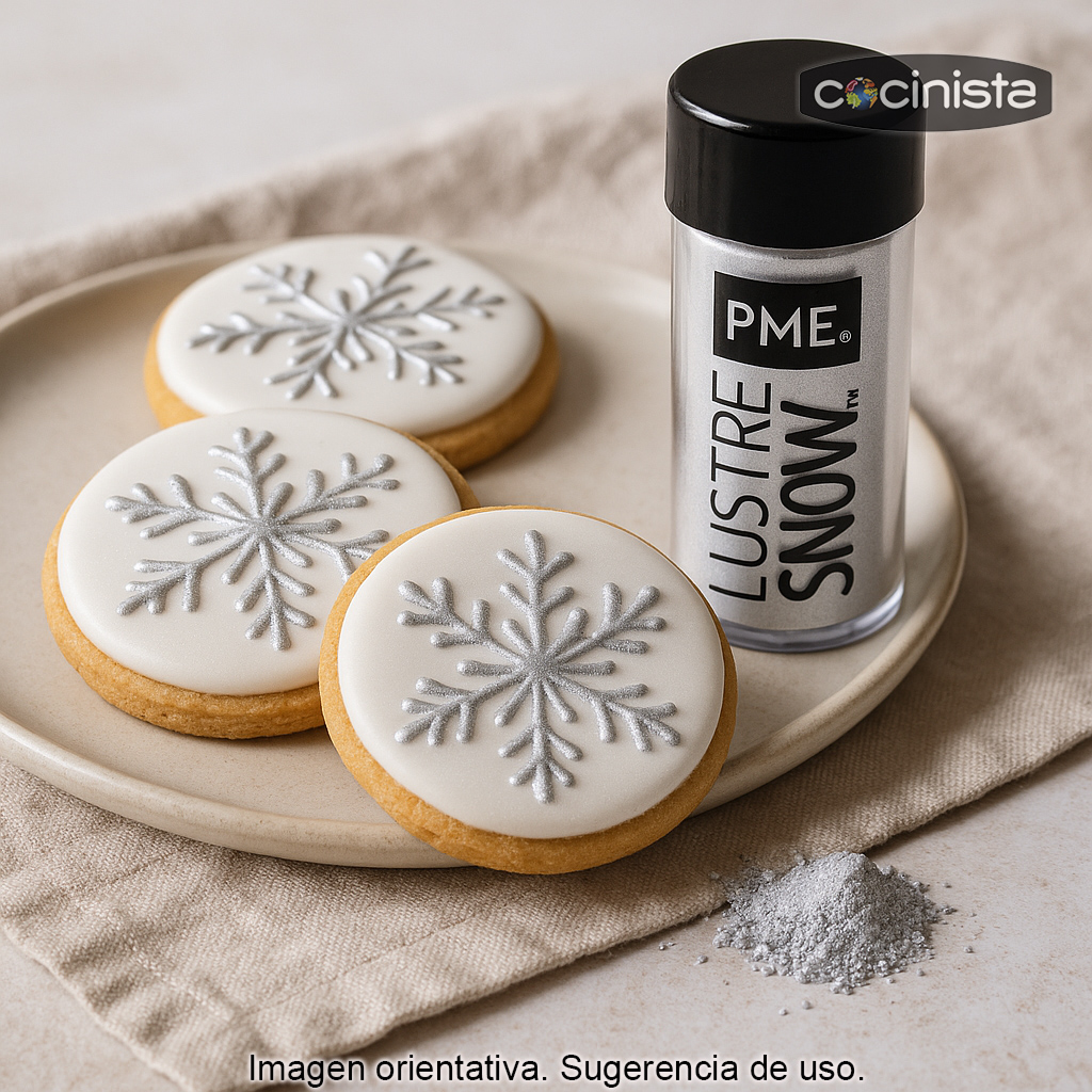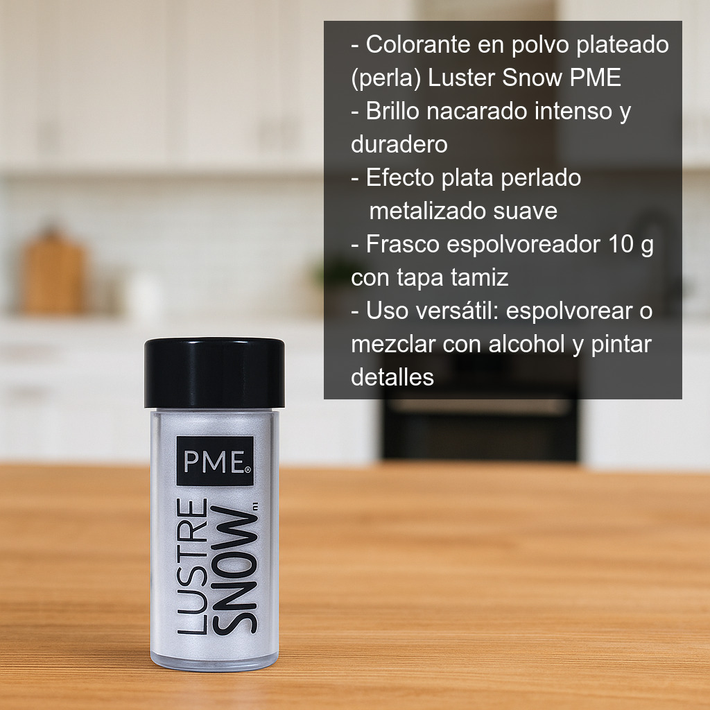 Consigue un acabado sofisticado y profesional en tus postres con el colorante en polvo comestible plateado (perla) Luster Snow de PME. Este polvo nacarado está diseñado para aportar un brillo intenso y duradero, perfecto para elevar la presentación de tartas, cupcakes, galletas decoradas, figuras de azúcar, bombones y todo tipo de elaboraciones de repostería creativa.