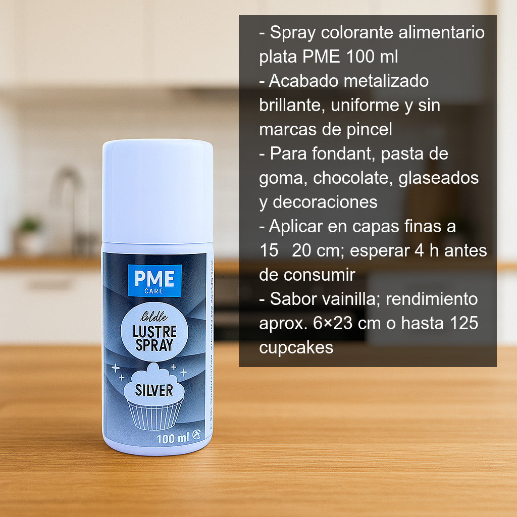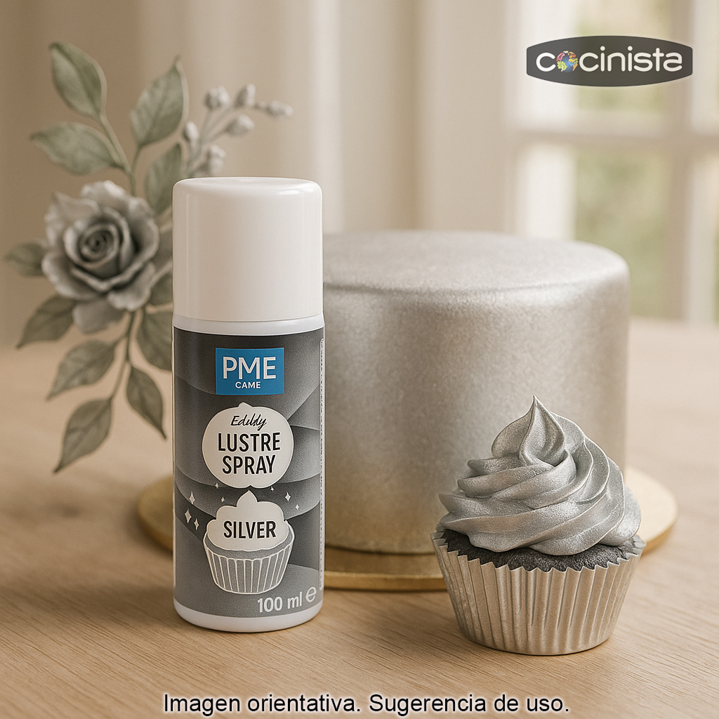 Consigue un acabado metalizado espectacular en tus creaciones con este colorante alimentario en spray plata (100 ml). Se trata de un spray comestible brillante ideal para aportar un efecto plateado luminoso de forma rápida, uniforme y sin marcas de pincel, perfecto para repostería creativa, tartas de celebración y decoraciones de pastelería profesional.