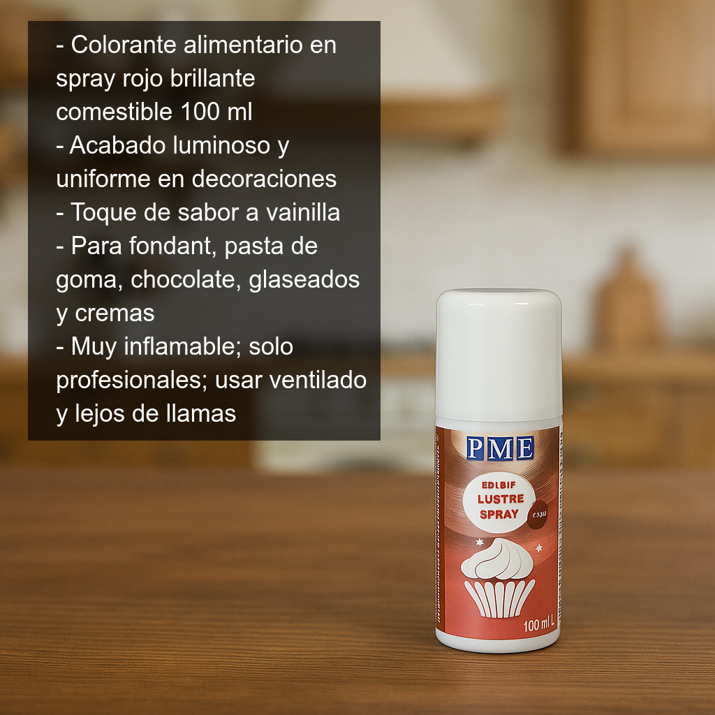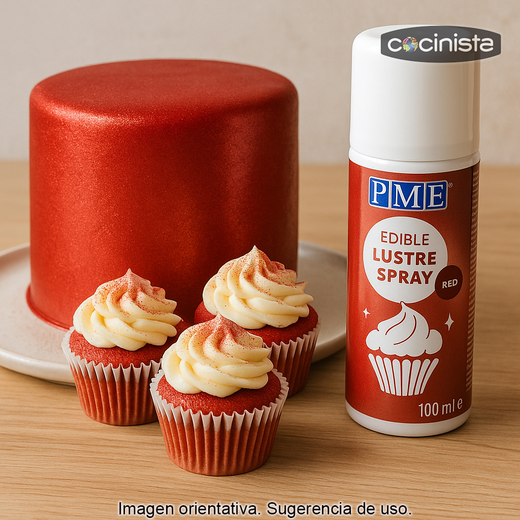 Colorante alimentario en spray comestible brillante de color rojo (100 ml), ideal para dar un acabado luminoso y uniforme a tus decoraciones de repostería. Este spray permite colorear de forma rápida y limpia superficies ya terminadas, aportando un efecto brillo y un agradable toque de sabor a vainilla.